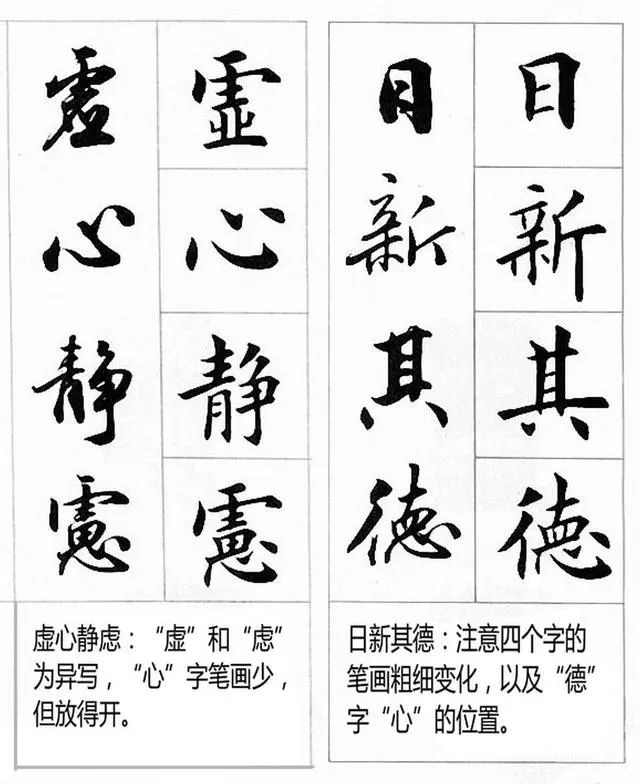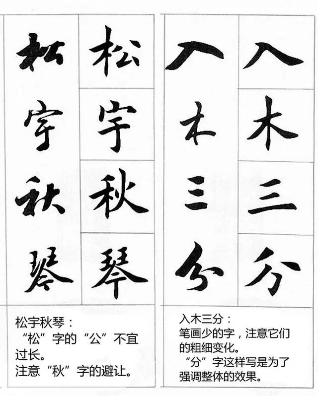 花点时间,仔细观察下面这些图片中楷书以及行书的结构,另外,认真阅读底部说明部分,对照图中的字进行揣摩,相信会给你的学习带来很大的收获。