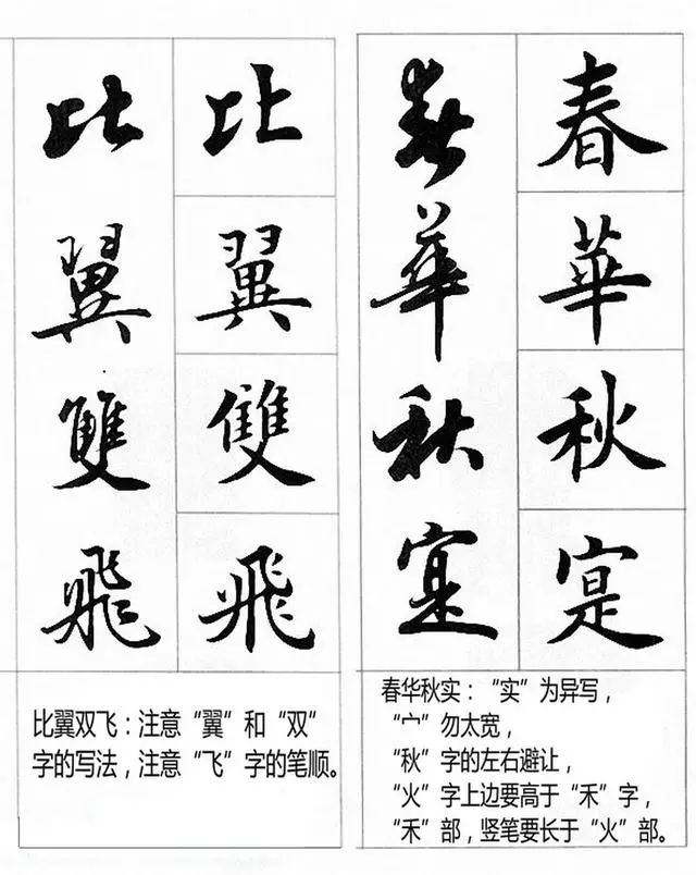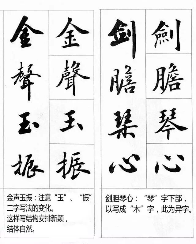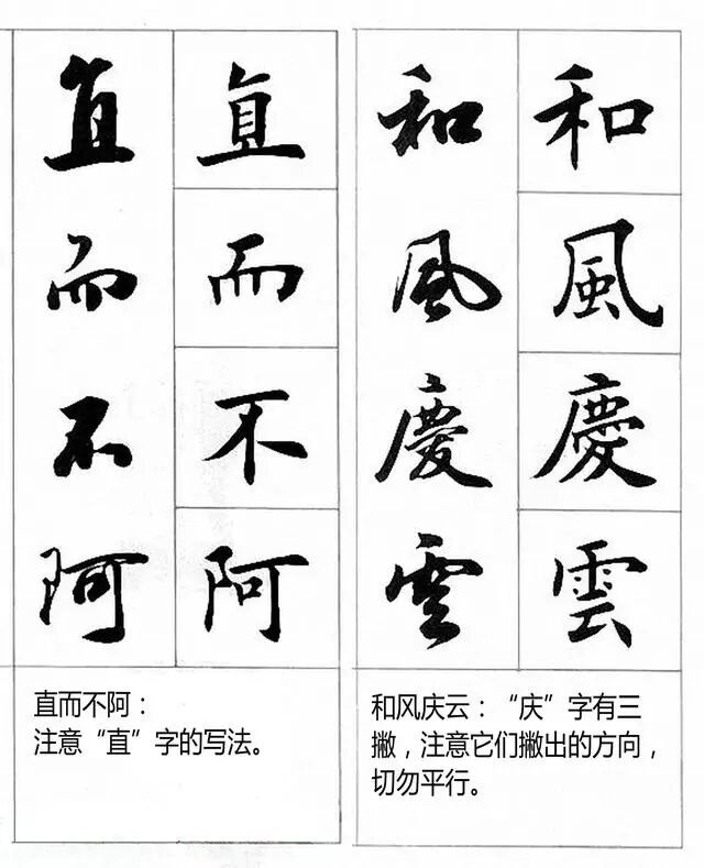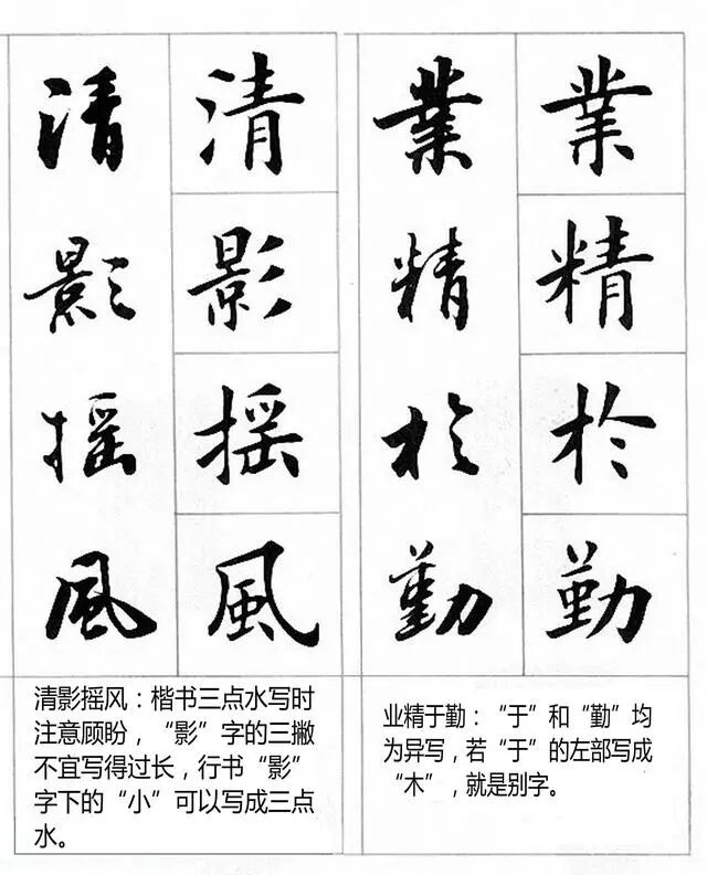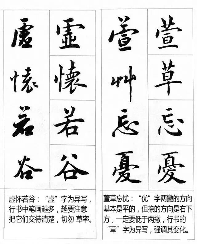 那么,如何相对"科学地"将楷书转换到行书?基本原则是大道理,从宏观上指导人们的思维和实践,具体方法是明细要求,从微观上规范人们的日常行为。书法实践不能光讲大道理,要有具体要求来规范操作过程。"变"是楷书向行书转化的关键。下面用实例来做印证说明。