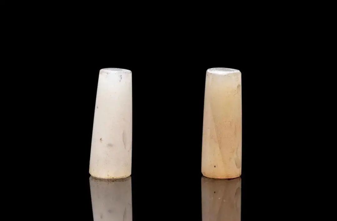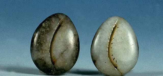 左长1.7、中长1.6、右长1.4cm。白玉,圆雕,器型与北京大葆台汉墓所出玉鸟形坠较为相似,似鸠似鸽,在腹部均有一圆穿孔。左边一鸟还有金圈相连。小巧精致,颇为生动。