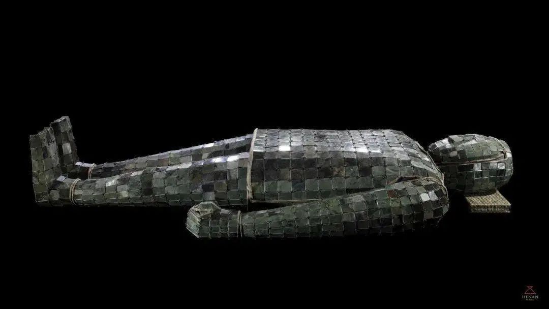 玉衣出于西汉末期梁王墓,长度为1.76米,玉衣分为头部、上衣、 裤筒、手和鞋五大部分。头部由脸盖和头罩构成,脸上勾勒鼻子的轮廓。上衣由前片,后片,左右袖简组成。裤筒、手、鞋各分左右两件。手部作握拳状,鞋为方头高腰形。全套玉衣共用2008片不同色泽、不同大小、不同形状的玉片组成,以碧青色玉衣片数量最多。玉片之间用金丝加以连缀。另附有供手握的玉猪、口含的玉蝉、玉耳塞、玉鼻塞等与玉衣构成一套人体外完整的外衣。