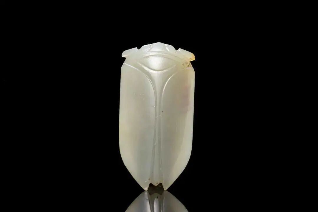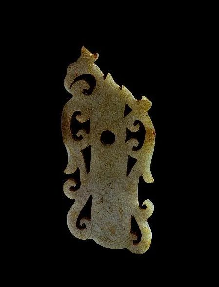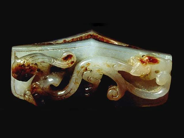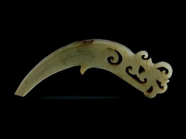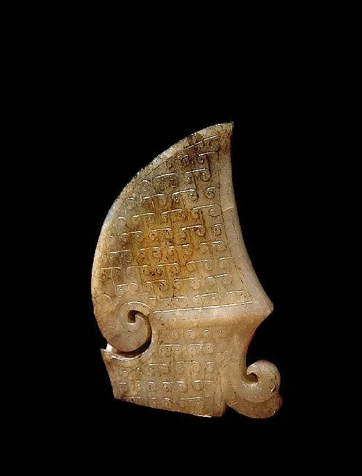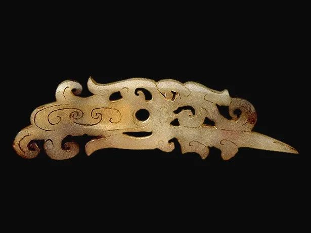 长6.6、宽4.4、厚1cm。白玉质,局部有褐色沁。器型近似三角形刀尖状,中部起脊,满身浅浮雕勾连云纹,左右两端各卷云形镂雕。此器形仿兵器,汉玉中少见。