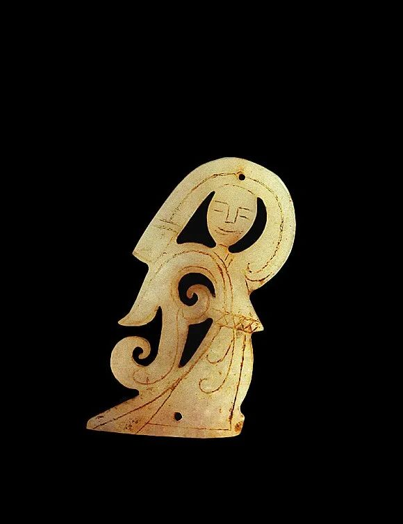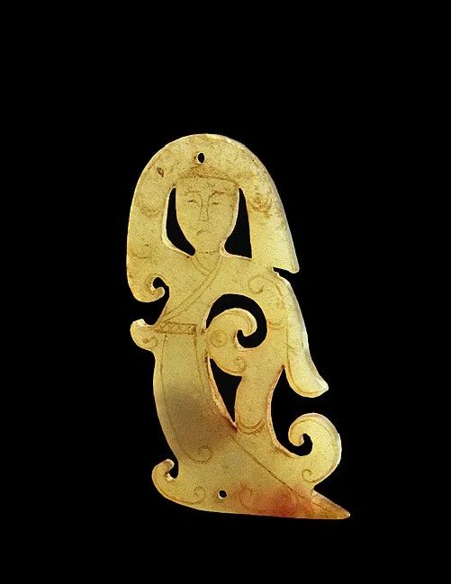 白玉质,扁平片状。面透雕舞人形象,舞人身着交领长袖衣,折腰束带,腰向一侧弯曲,一袖翘起抛过头顶,一袖从腰部下垂,作翘首折腰状,长袖翩翩,姿态优美。北京大葆台也出土过此种玉舞人,不同的是此舞人上扬手臂衣袖稍短,下垂衣袖呈三片状,并且表情更为丰富,呈微笑状,身体前倾,腰束网格纹宽带,并以阴刻线勾饰衣纹,上下各有一圆穿孔。