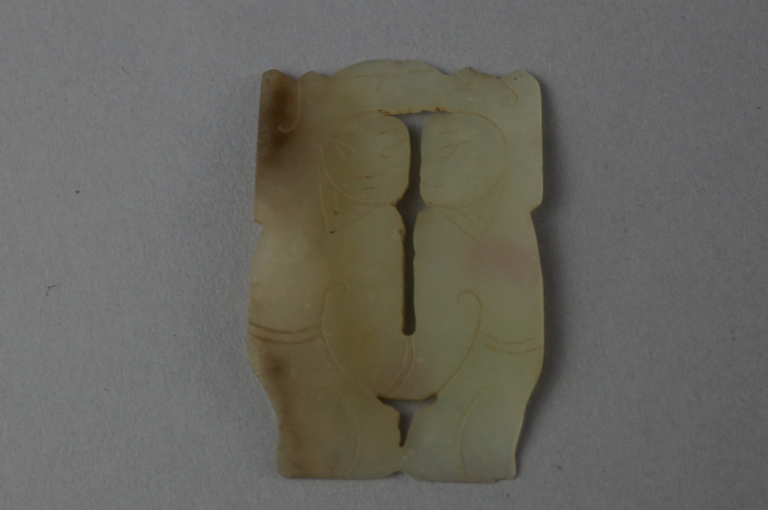 长4.55cm、宽3.05cm、厚0.3cm 。白玉质,扁平片状。透雕两人对舞,两人一手上扬相连,一手下垂相握,连成一体,线条简朴流畅,精巧别致,关注公众号:老货圈。人物表情及衣纹以阴刻线表示,连体舞人在战国洛阳金村墓中曾有出土,汉代少见。