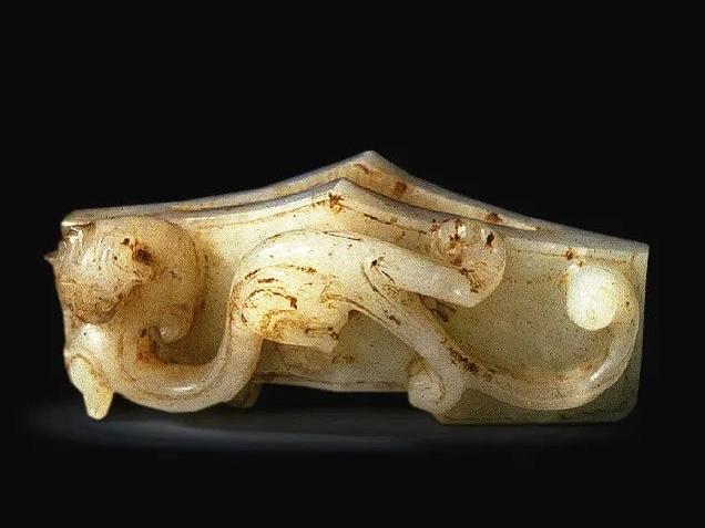 长5.9、宽1.9、厚2.2cm。白玉籽料雕琢而成,器表留有红皮,玉质上佳。剑格一面用高浮雕及圖雕技法雕一螭虎,匍匐爬行,并利用红皮俏色螭面.螭后腿被一小熊咬住,形象可爱。剑格另一面阴刻兽面及卷云纹。整体构思巧妙,匠心独运,是汉玉中之精品。