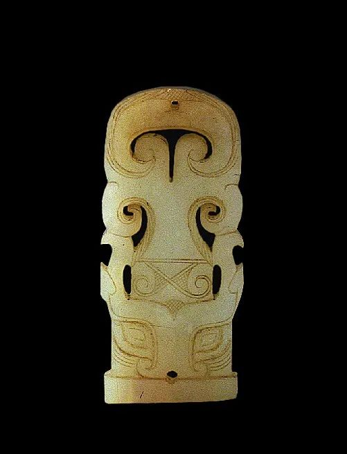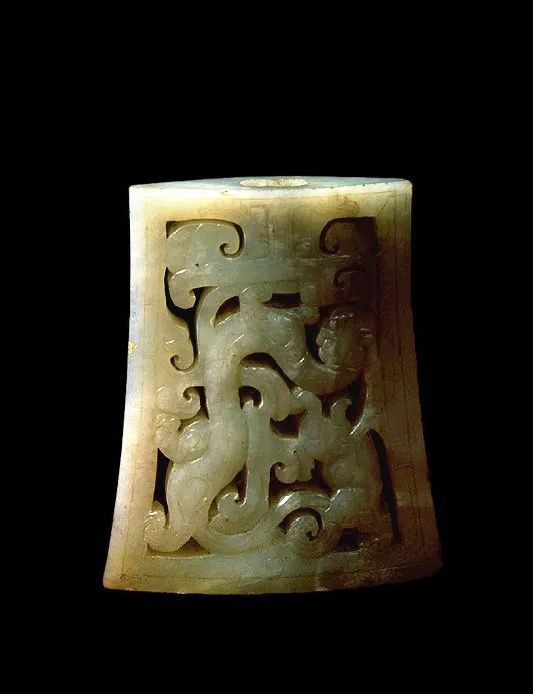 长4.8、宽2.5cm。白玉,玉质温润。透雕,器略呈长方形,在一小台座上有一兽面,大鼻、大眼,双角上扬,兽面之上为几何纹及透雕卷云纹,身多处饰有绳索纹和网格纹。此器上下有两穿孔,造型独特。