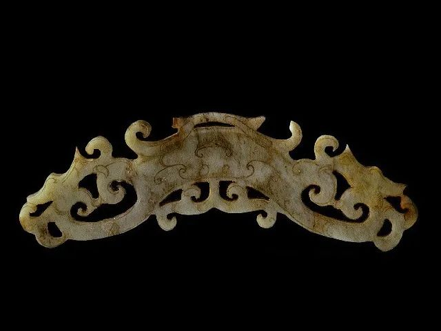 长9.8、宽2.7、厚0.4cm。白玉质,片状透雕双龙首连体璜,呈扁平半环拱形,采用透雕和阴线刻两种工艺雕琢而成。边沿雕饰卷云纹,正中有一长椭圆形孔,两端雕成对称的连体龙首形,且各有一小圆孔,纹饰以阴刻线雕饰,下部出廓透雕卷云纹,造型优美。