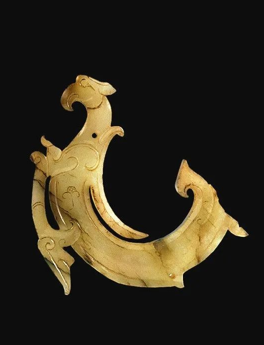 长5.4、宽2cm。青白玉,凤钩喙,杏眼,挺胸屈身,胸前有一朵花蕾纹,内饰网格,尾部已残,凤颈、底端及尾部都有一穿孔。