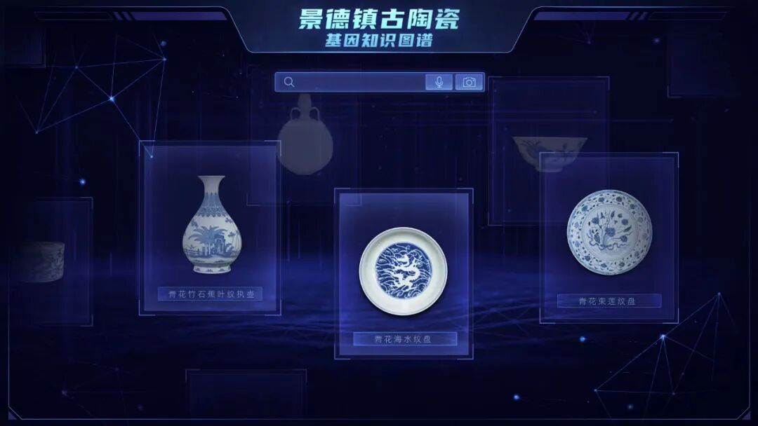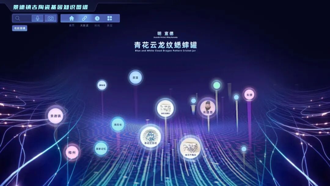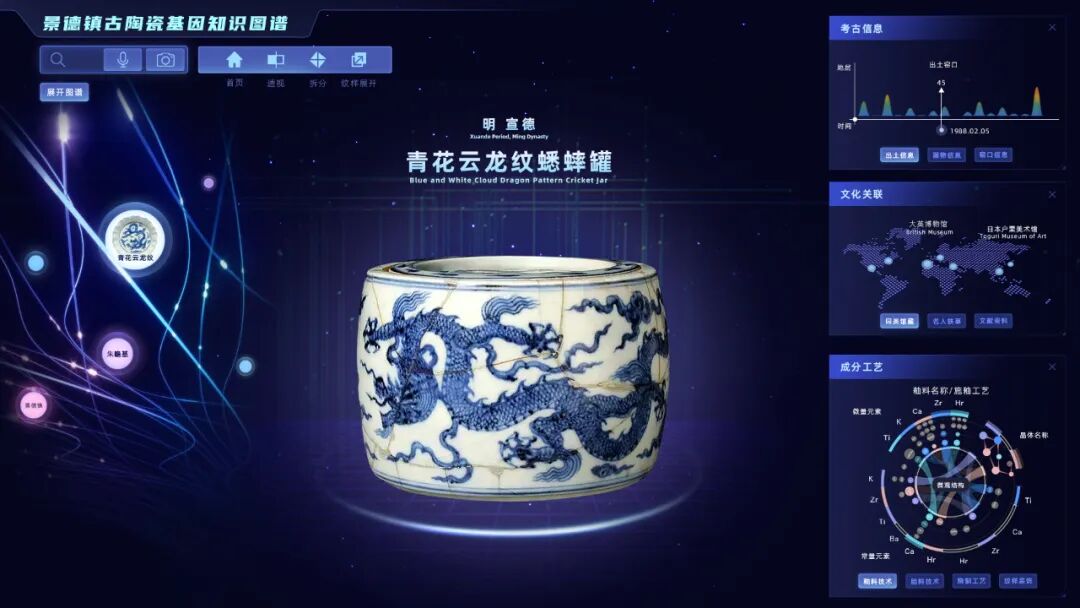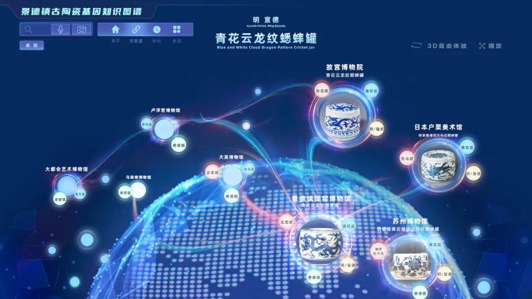 打开基因库管理平台,在搜索引擎中输入“明宣德青花云龙纹蟋蟀罐”试试?真实而立体的青花瓷罐三维图像便出现在屏幕中,考古年代信息、成色工艺、海内外博物馆收藏情况……无比酷炫的基因图谱也同时显现。此外,点击“朱瞻基”“青花瓷”甚至“周杰伦”等图标,还能了解更多相关的陶瓷文化知识。