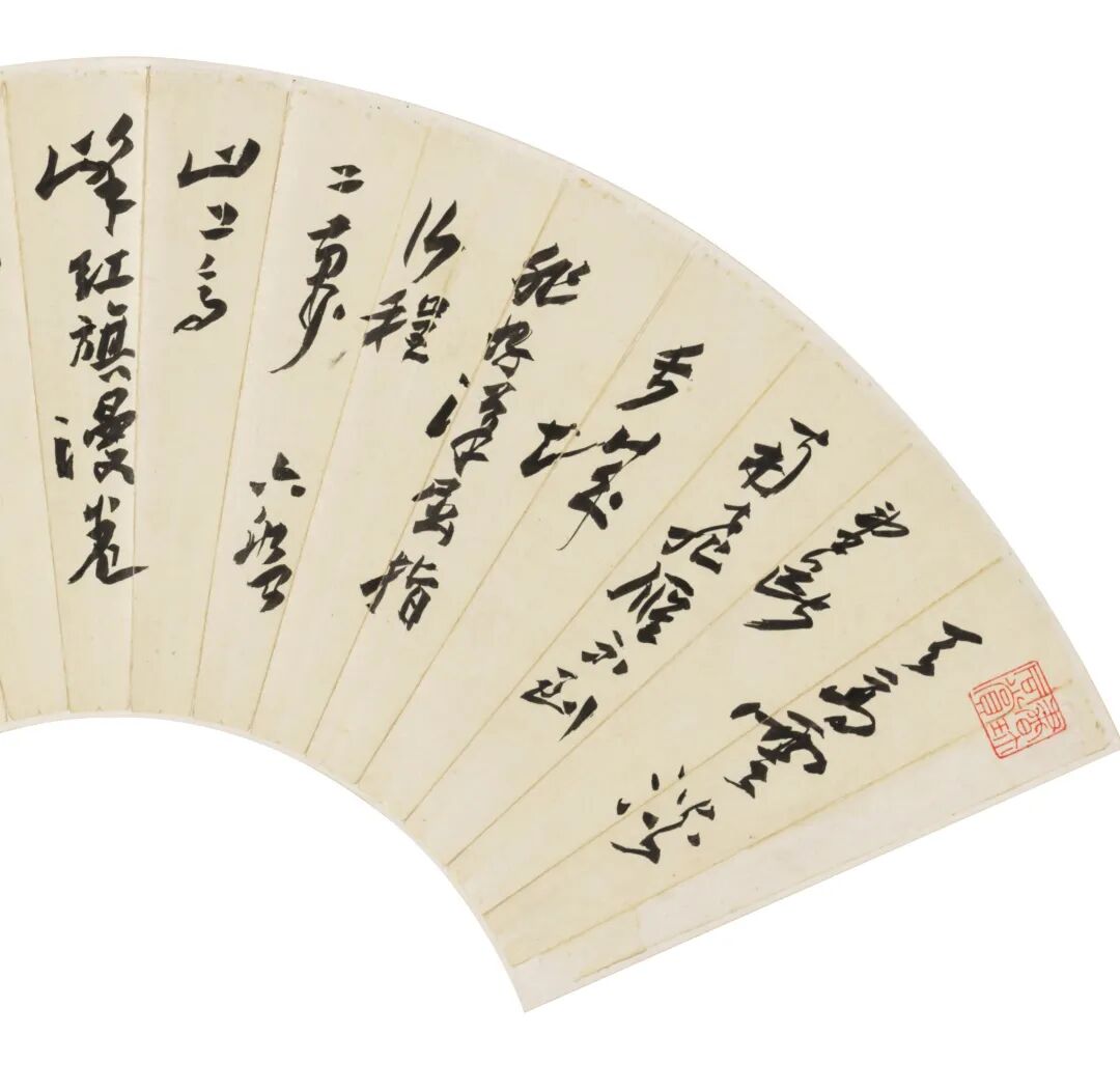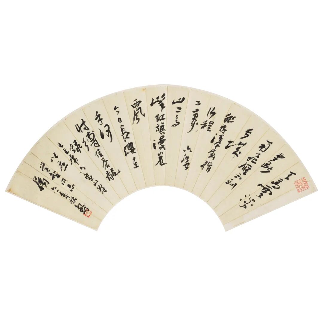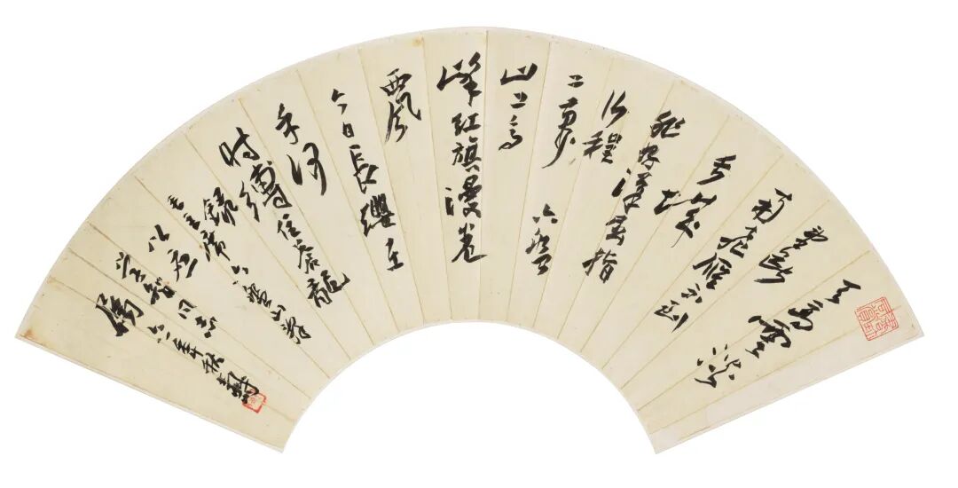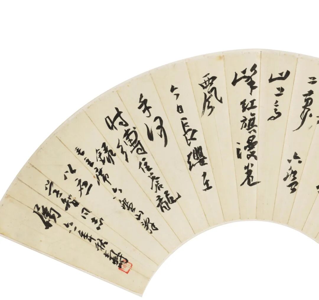 潘天寿的书法一如他的绘画,气魄沉雄,丰姿挺劲,具有独创精神,且将书画同源的道理表现得淋漓尽致。其诸体皆精,尤其行书,个性极强,善于制造险绝,用笔十分老辣。此幅行草扇面极具艺术表现力,强悍霸气,有险峻之感,笔笔见方,在转折之笔上,将险绝表现得斩钉截铁,没有一丝拖沓。