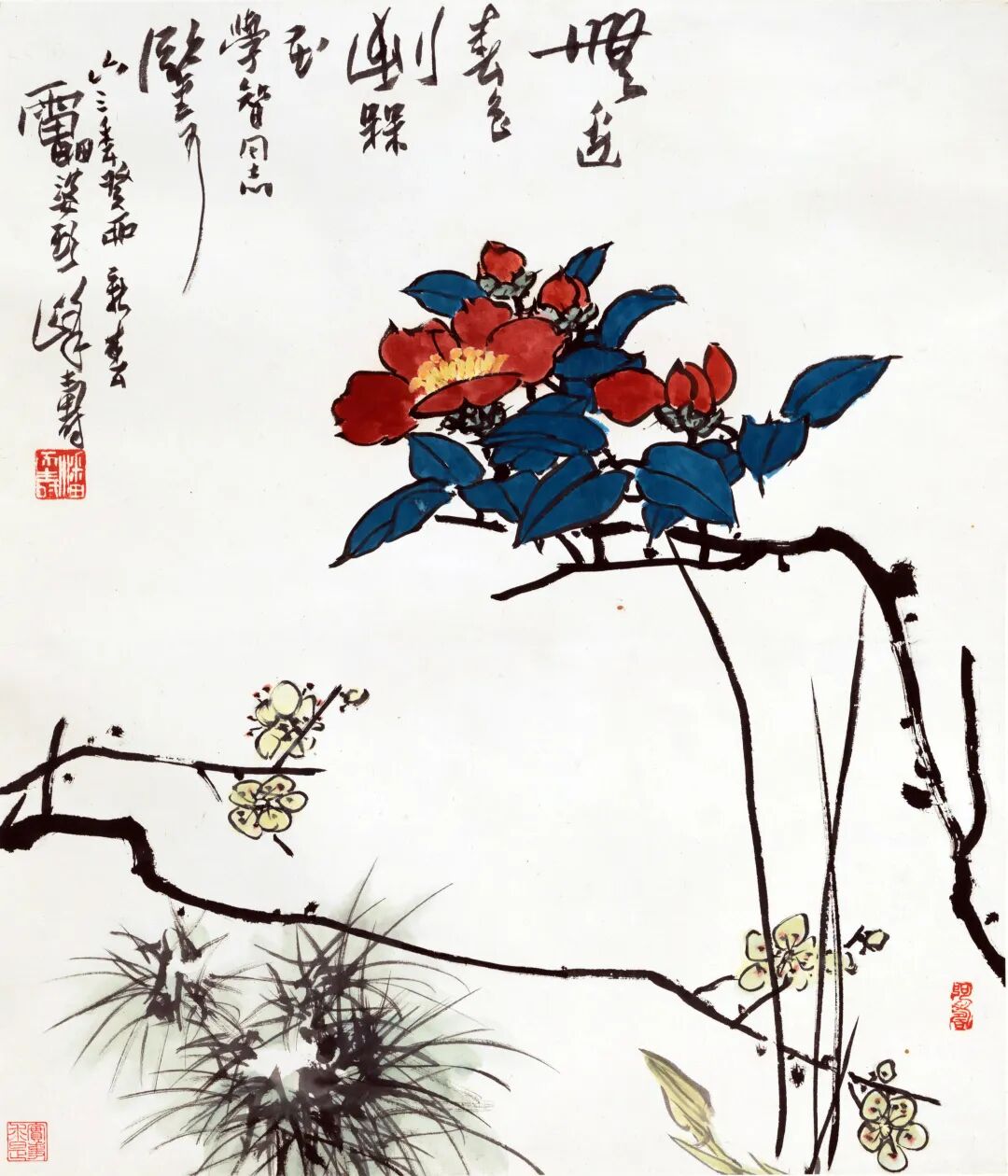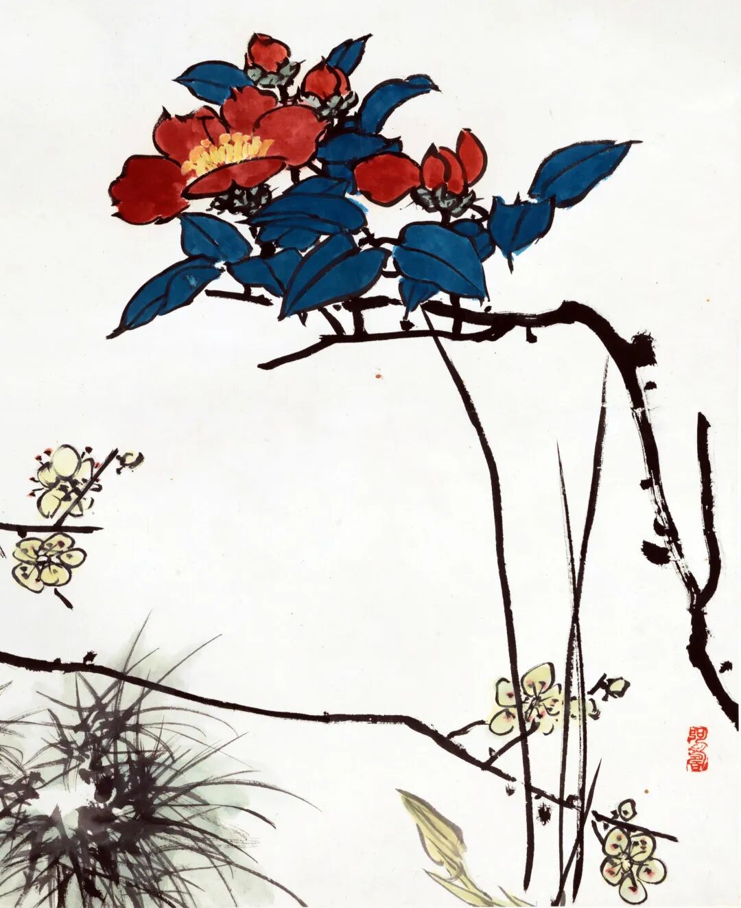 画面中数朵花姿丰盈的山茶花、梅花与郁郁葱葱的小草纵横交错,韵味十足。画面右上方留有空白,使整个画面富有张力。作品中山茶花与梅花于凌寒中独自开放,有着不惧艰难、高洁孤傲之寓意, 在逆境中拥有乐观向上的积极态度,更富高雅坚韧赞美之意。
