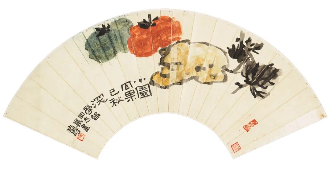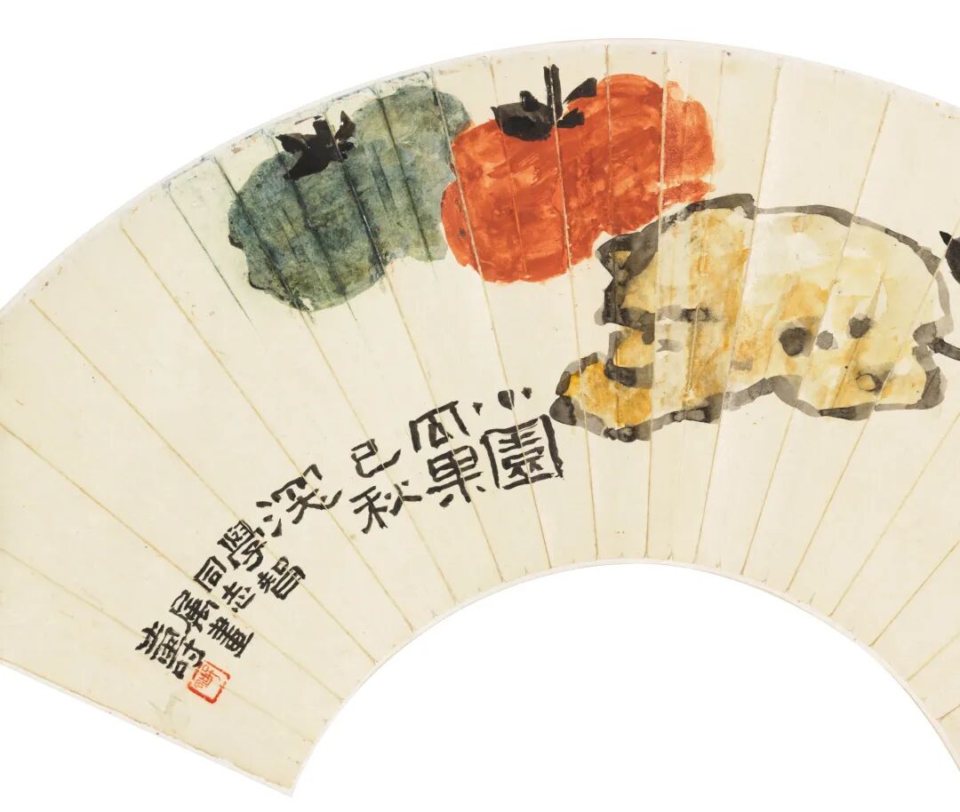 柿子和佛手瓜均为秋天风物,也都是秋天的象征。柿子预示“事事如意”,“佛手”谐音 “福寿”,寓意福寿绵长。独具匠心的选题组合,无疑是传统吉祥文化在画作中的表现。此幅《小园瓜果已秋深》,可谓潘天寿为数不多果蔬题材中的精品。画面中两只柿子,一青一熟,一带叶的佛手瓜,构图简洁疏朗,趣韵无穷。此作虽小却精妙,笔墨和形式简练,颇有古意,给人留下了无穷的审美空间,观者意犹未尽。潘天寿很欣赏古意。他说:“要辣、要古,不要甜。