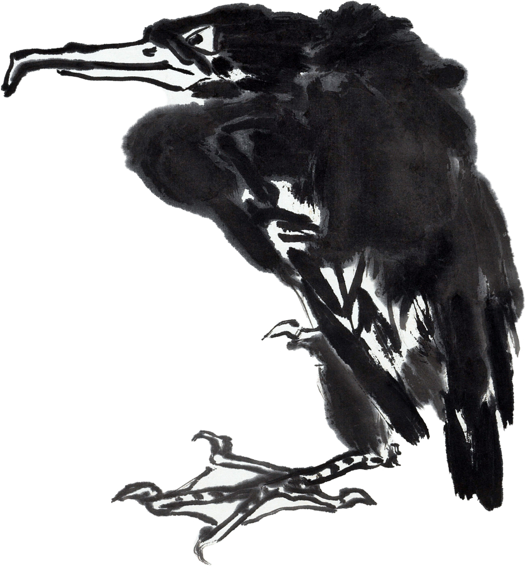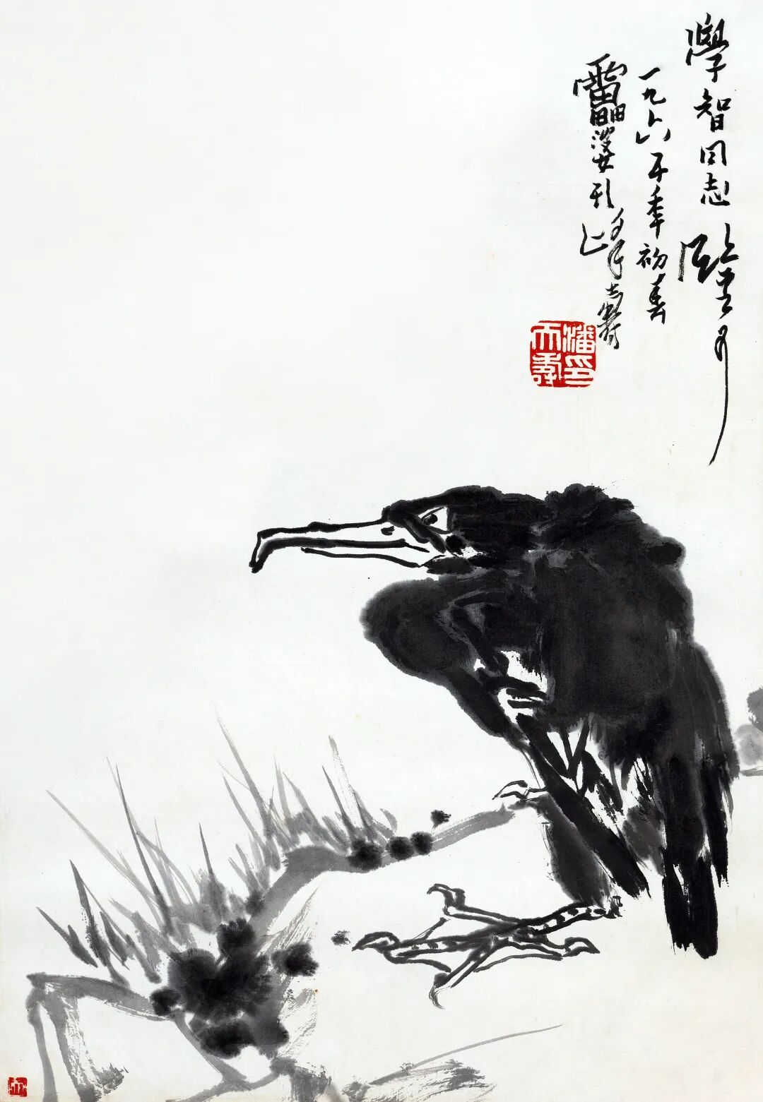 潘天寿的花鸟画独具特色,在他的鸟禽题材中,老鹰、秃鹫、鱼鹰、八哥、山鸟比比皆是,对鱼鹰甚钟爱,在他赠给友人的花鸟画作品中,鱼鹰图可以说是创作最多的题材。画幅右下角倦缩着一只乌黑的鱼鹰,似捕猎后的小憩,然而表情专注,旁若无人,注视着远处的动静。鱼鹰身体以浓墨笔扫出,几处留白显出尾羽的层次,笔墨和造型莫不浑厚苍凝。脚下石头线条刚劲,几笔水草支立石边,则是永恒和不息生命传承的喻示,整幅作品古雅而寂静,极具朴拙古意。又以行草题跋于画面右上处,整体布局左空右满,高低上下,虚实相映。潘天寿言:一般人只注意在画面上摆实,而不知道怎么布虚。实际上摆实就是布虚,布虚也就是摆实。