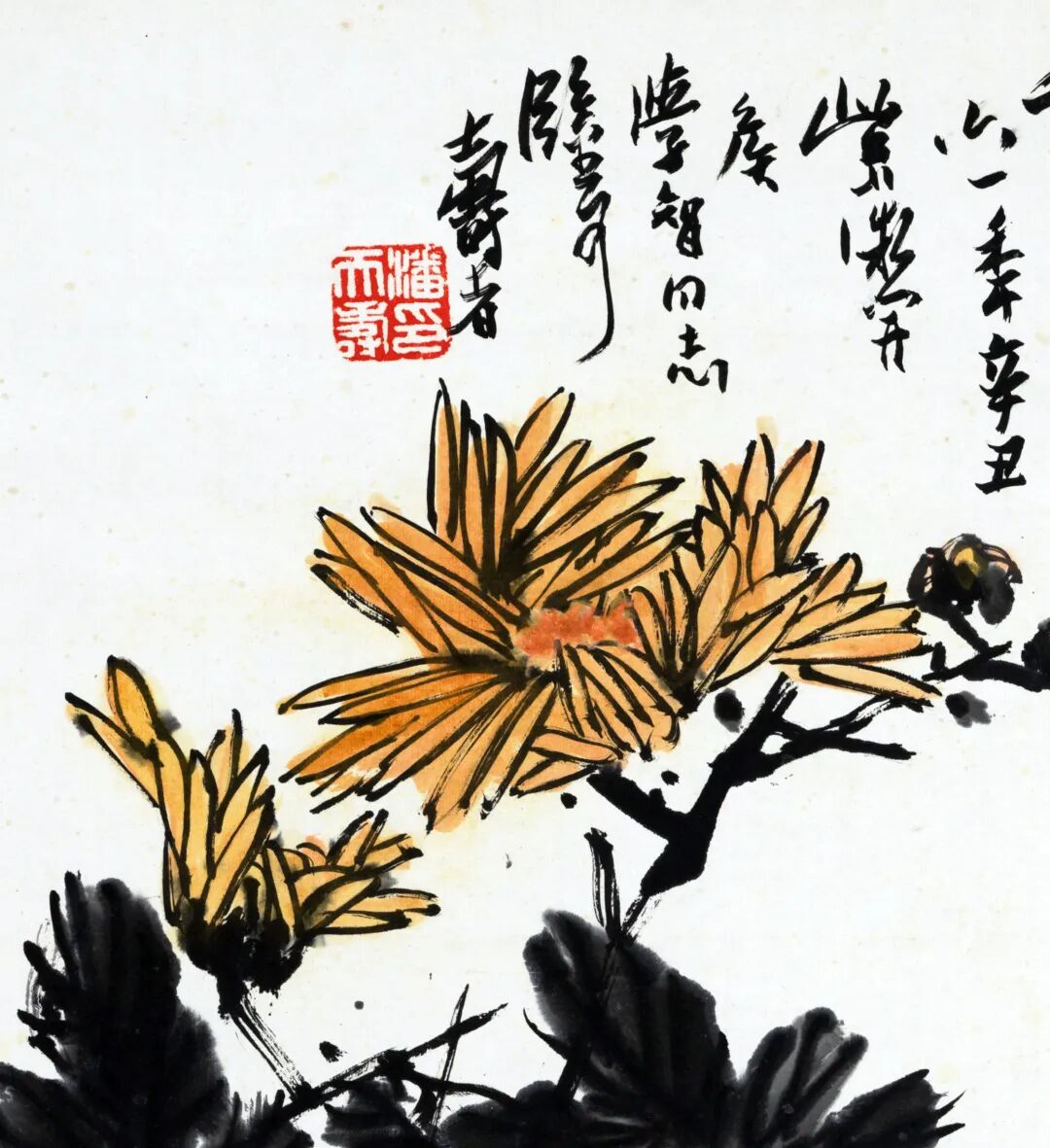 菊花应是潘天寿最具代表性的花鸟题材。以菊花为描绘主题,有着特定的含义。菊花象征着正直不屈、高雅纯洁和清净隐逸,是世外隐士的象征。此幅作品创作于1961年,无论是在构图、着色还是题款上,颇有巧妙构思。画面中花瓣颜色饱满艳丽,以书写而成,落笔老辣。