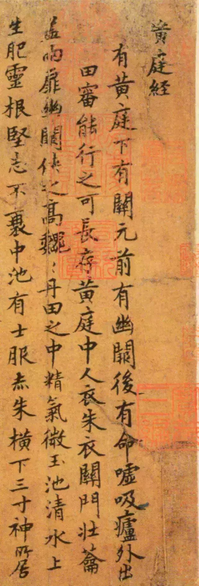 《唐人临黄庭经》(故宫博物院藏)就是一例。《黄庭经》本来有多种版本,本文为五十八行文字组成(连上标题、跋尾各一行共六十行),从本文第九行中间缺大约六个字的地方来看,与水痕本是同一系统的,书法风格和初唐盛行的欧、虞风格的小楷相近。因有硬黄纸本,所以此本好像是依据原本拓模而成,但是否真从王羲之真迹拓模而来,值得商榷。或许它就是唐人临本的其中一个,是明显带有欧、虞风格的书法。除此之外,还有唐虞世南书《黄庭经》(民国二十二年无锡裴氏壮陶阁藏本影印本)。这个在内容上与水痕本相近,但书法一看就是虞世南风格的。它被认为是初唐或者更早的临本,在《壮陶阁书画录》卷一中认为此本是唐初人书。小楷文字本来就小,用响拓方式来完成精密的拓模是较为困难。临书的方法很多,临本虽然能把原本的书式和文字结构都能显现出来,但把原迹的原样摹写下来还是比较难的。晋人小楷中能很好传承原本样子的基本没有,可能也源自这个原因吧。唐徐浩在古迹记中列举了诸位名家各自得意书体之后,指出陆柬之比较擅长临书。陆应该就是虞世南的外甥,年轻时跟随虞世南学习。之所以说他擅长临书,是因为他临写的与晋张翼模仿王羲之表奏很难区分。这里所说的临也是指尽量忠实依照原本的意思。日本正仓院《东大寺献物帐》上记有临王羲之诸帐书屏风,这与同样在献物帐上记录的大小王真迹书、拓王羲之书是有区别的。光明皇后所写《乐毅论》是王书的临本,这一点不容怀疑,这作为一个实例遗留下来。空海在《高野杂笔集》中记载,少年时代经常临古人遗迹。同样在空海《性灵集》卷四中记载,书刘希夷集献纳表中说文是秀逸之文,书法为褚临、王羲之遗体。这些例子所说的临也是传承了唐土习惯。总之,传承唐代二王典型的传统派书法中的临,大概都是与摹相近。颜真卿、张旭、怀素等革新派之后的临一直比较注重个性,这与之前的临在本质上有些不同。至宋代,临与摹的区别更加明显,也有人提出两个概念不能混同的意见。米芾《书史》中记载:『画可摹(不能临),书可临而不可摹。』明李日华的《紫桃轩又缀》卷一中记载:米元章所谓书可临可摹,画可临但不可摹。临得势,摹得形。如果画只得形的话容易变成专职事务,就会逐渐失去画的精髓。后人也用极其含蓄的语言区分了临与摹的性质。黄伯思在《东观余论》中也提及了临摹二法:『世人多不晓临摹之别,临谓以纸在古帖旁,观其形势而学之,若临渊之临,故谓之临。摹谓以薄纸覆古帖上,随其细大而拓之,若摹画之摹,故谓之摹。又有以厚纸覆帖上,就明牑景而摹之,又谓之响拓焉。临之与摹,二者迥殊,不可乱也。』这与前面提到的游宦纪闻的说法是一致的,可能这个说法更早。宋姜夔在《续书谱》的《临》这个条目中道:『临书易失古人位置,而多得古人笔意。摹书易得古人位置,而多失古人笔意。临书易进,摹书易忘,经意与不经意也。』可见,至宋代多论及临与摹的区别,两者的意义也逐渐稳固下来。硬黄与响拓也被认为是摹的一种,所以广义上来说,所有用临的地方都可用摹。但是,相对于硬黄和响拓这些特殊方法来说,摹意味着只是用普通的纸、普通的方法进行临写。所谓硬黄指的是在纸上涂上蜡,使其透明,用这种特殊纸进行摹写的方法。张彦远《历代名画记》卷一中论及画体工用与拓写时记载道:『好事家宜置宣纸百幅,用法蜡之,以备摹写。』据此可以证实在唐代就有用蜡纸摹写的方法。在原注中,还附记了晋顾恺之有摹拓妙法一事。在米芾《书史》中也能看到很多用蜡纸摹本的例子。《唐摹右军帖》,就是现在的《奉橘帖》,用的就是双钩蜡纸摹,也叫做硬黄纸本,是用硬黄的方法制作的最好实例。褚遂良的《枯木赋》是粉蜡纸拓书,智永《千字文》是唐粉蜡纸拓书。《兰亭序》也有粉蜡纸拓书。右军书的《唐摹四帖》中,有两幅是冷金纸硬黄。这些都是硬黄的例子。宋岳珂在《宝真斋法书赞》卷七中记载:唐人摹王右军《转胜帖》用的就是冷金纸,未装裱时会发出银叶般声响,薄如蝉翼,实属罕见之物。冷金纸好像就是在纸上施以泥金或者洒金。根据《书史》记载,王羲之的《玉渊帖》就是在冷金纸上双钩摹帖。现在所知的王羲之《游目帖》是冷金纸的摹拓。