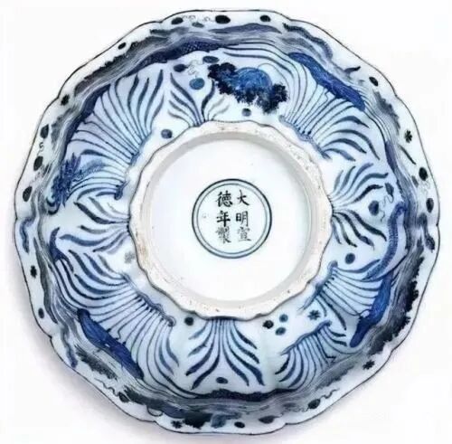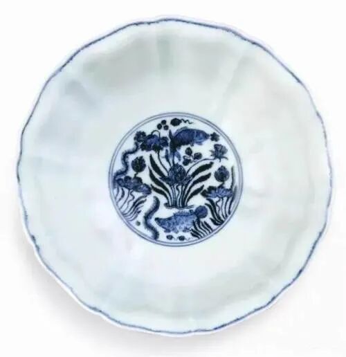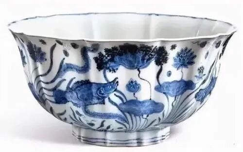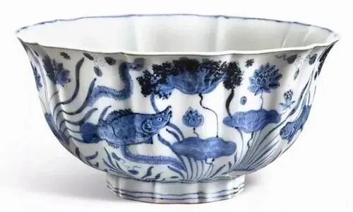 苏富比官网对该件拍品介绍颇有诗意:“御窑大盌,陶冶之巅,妙作十瓣花式,犹若荷叶半绽未放,捧于掌间,刚中带柔,抚之如脂,爱不释手。外壁起伏延绵,神绘游鱼四尾,两两相对,嬉泳水藻池莲之间,寄清白廉洁之德。白瓷为纸,青料作墨,妙笔挥毫,线条清劲流畅,栩栩如生,疏密得当,浓淡相宜,宣德重器,传世孤品,独一无二,殊为珍稀。”![]()