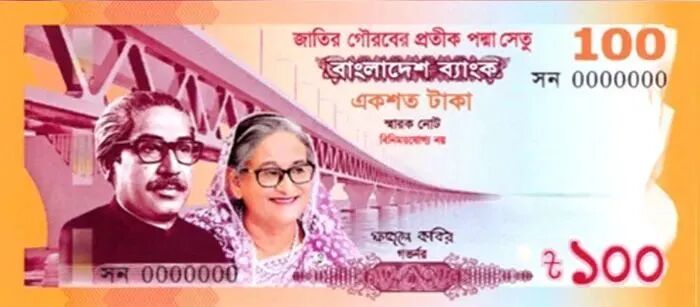 纪念钞的图案展示了帕德玛大桥的形象,以及孟加拉国开国总统穆吉布·拉赫曼和他的女儿暨现任总理谢赫·哈西娜。