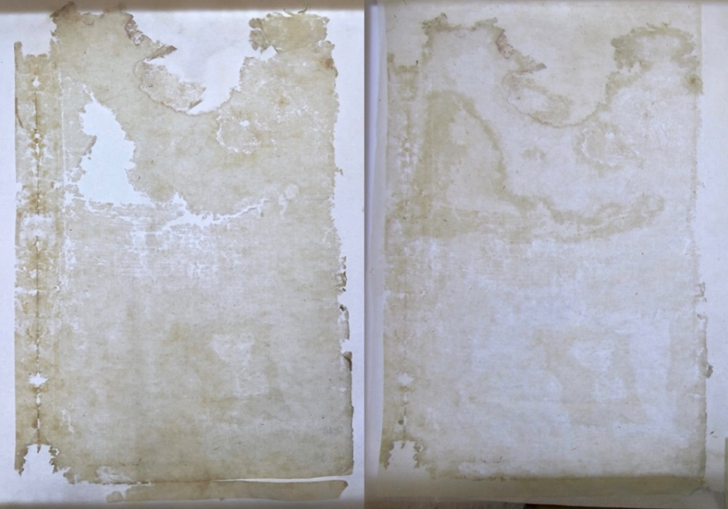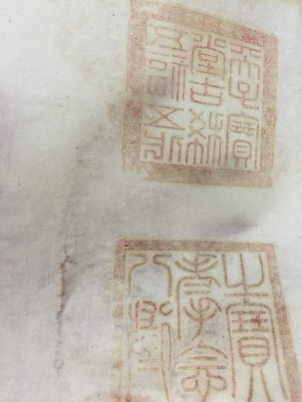 纸张作为古籍的载体,既怕火又怕水,其损坏的形式主要有变质与物理性损坏两大类。絮化是皮料纸文献常常出现的一种损害现象。它往往是由受潮起霉引发的,受到该种损害的古籍,书叶往往如棉花一样蓬起,纤维稀松,甚至变质,导致古籍难以翻阅,甚至分不清叶与叶的界限,书叶上的文字也会因此出现错位、不清楚等多种问题。该册书的前书皮及内侧纸,以及前后护叶,都不同程度地出现了絮化的现象。考虑到絮化纸张整体状况良好,而前后第二张护叶又均印有乾隆的“大三玺”,为避免影响古籍的文献信息与装帧形制,故不更换,而是对前书皮、内侧纸以及各个护叶采取相应的修复措施。修复中,不拘泥于补纸搭口的宽窄,而特别注意采取了隐补的技法,在加固絮化位置的同时,尽可能避免补纸与絮化边沿衔接生硬给书叶造成二次伤害。尤其是对于“大三玺”附近絮化的部分,不仅需要保证不影响玺印,还需要合理承托絮化的部分。![]()