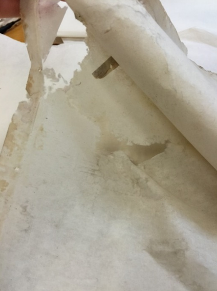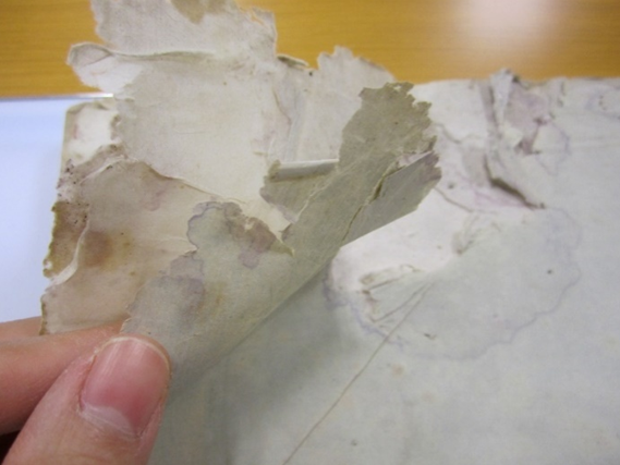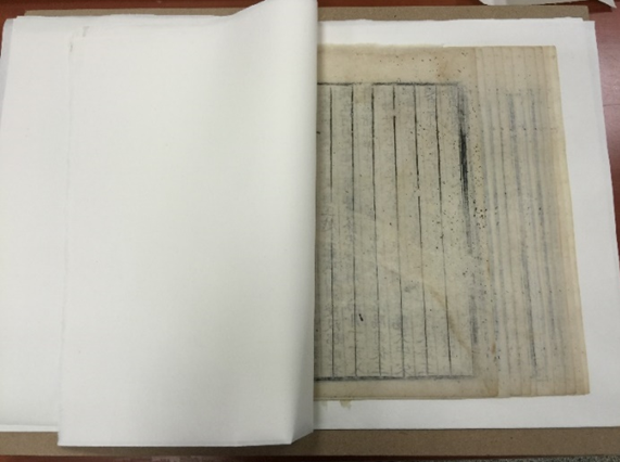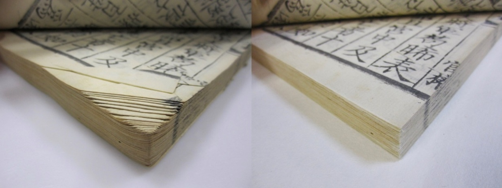 “天禄琳琅”藏书流传过程中,除了受到贮藏环境的影响,也受到人为活动的影响。该册有部分书叶,书口下角处有折叠与卷翘,应是在翻阅、摆放或运输时造成的。这种损害看似轻,但长此以往,纤维老化、断裂,就可能出现纸张的部分脱落,造成文献的缺失,装帧的损伤,形成难以挽回的物理性损坏。遇到这种情况,则须先观察折叠、卷翘处是否已断裂。如若已有多叶断裂,并伤及文字,即便断裂面积不一致,也要做好标记工作,以防接错。而该册书并没有伤及文字,折叠、卷翘处弹性较好,故在修复中采取正常压平的措施,让其舒展自然。![]()