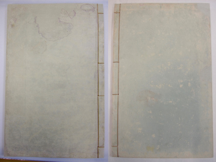 本册包角已经佚失,但本部书其他册均有包角,为保持整部书的统一,补配包角。由于古籍在流传过程中边缘部分常有磨损,不仅书的边沿存在弧度,书的前侧、后侧常常大小也不一样。上皮时,要先确认书皮的前后、上下,再比对书皮的位置,之后顺着书的边沿、窝折,最后用两股线按书皮上的原眼订回。![]()