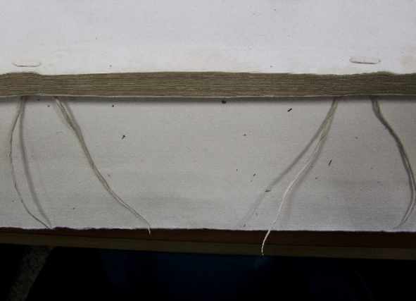 为了保持原装帧形制,并不影响阅读,在装订时,选择原眼订回。但因本册曾被多次改装,书脑狭窄,书眼繁多,有些书眼几乎相邻而下,有些书眼甚至已经打在版框上;加之此部《通志》册数众多,为了整体的一致性,在下捻和订线时,就要特别仔细分辨书眼。尤其像书捻的位置与状态,应是在修复开始的拆解时,就做好记录,以备之后的装订复原。在订线时,虽然是按书皮和护叶上原有的四个线眼订回,但因书叶压平后,书眼也随之平整,整册书又较厚,在正式订线前,还是要对四个订线眼进行疏通,以免中间出现走位到其他书眼,影响整体的装帧与古籍的保护。![]()