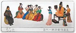 2001年中国人民银行发行了一枚《韩熙载夜宴图》纪念银币。这枚银币很生动地刻画了韩熙载精彩纷呈、放纵不羁的夜生活!