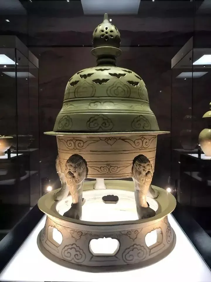 如果你来到这座博物馆,那么,目标明确,可以直奔三件镇馆之宝:越窑青釉褐彩云纹熏炉、越窑青釉褐彩云纹盖罂、越窑青釉褐彩云纹灯,均来自吴越国王陵中钱镠的母亲水丘氏的墓葬。