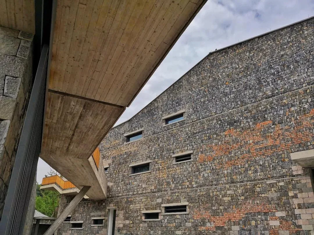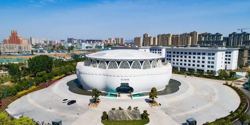 青瓷博物馆外形借鉴汝窑天青釉莲花碗造型,主体以八片花瓣组合而成,顶部排列冰裂纹窗花,入口处为瓶形剪影,整个建筑简约大气。