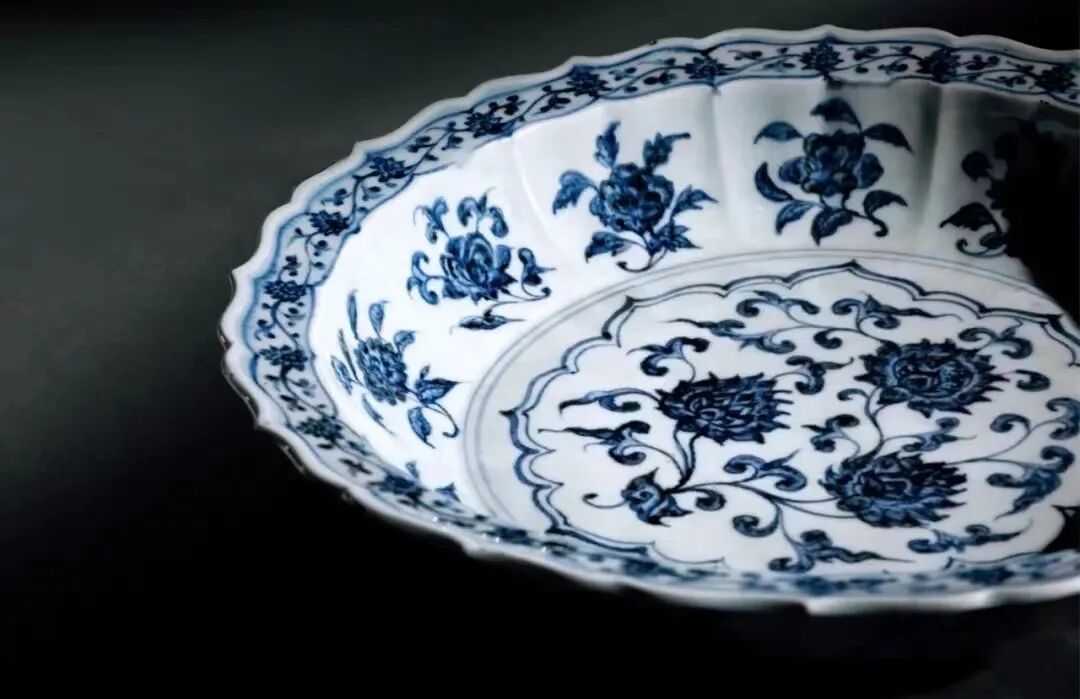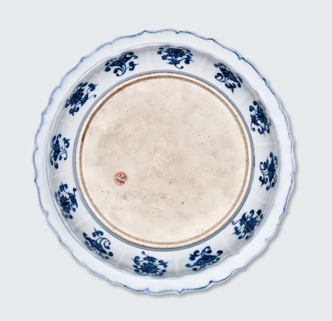 此类菱花口大盘器型始见于元代,非中国传统瓷器造型,而与中亚陶器及金属制大盘十分相似,应为适应中亚伊斯兰国家需要所制,是当地贵族围坐吃抓饭之宴饮佳器。其口沿边饰的缠枝花卉纹更见浓郁的中东伊斯兰艺术之风格。当时不止景德镇御器厂一处烧制,龙泉窑亦曾烧制与此器形、纹饰一致的各式大盘。元至明初中西海陆文化贸易交通发达。永乐朝郑和下西洋,极一时之盛,故其不但是陶瓷史中的重器,也堪称中西交流的宝贵见证。