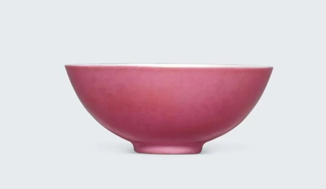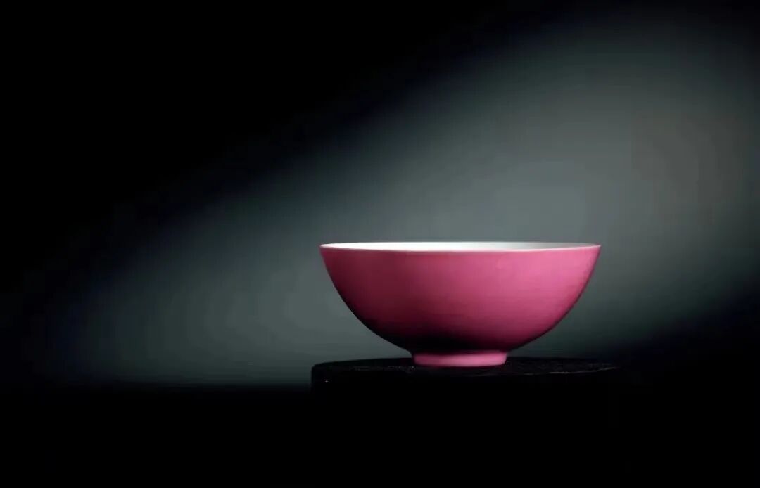 胭脂红釉因颇如女子化妆的胭脂之色,故而得名,清宫档案内称其为“西洋红”,雍正十三年(1735年)唐英所撰《陶成纪事碑记》中记载当时岁例贡御的五十七种釉、彩中即有“西洋红色器皿”。胭脂红釉料以金为呈色剂,本为珐琅彩料之一,由欧洲传入中国,康熙末年始见单色釉器,以吹釉法施釉,低温烘烧而成。创烧之初,胭脂红釉料尚需进口,并以金为呈色剂,因此数量稀少,珍贵异常。此后在雍正皇帝的指示和怡亲王的主持下,各色西洋珐琅彩料相继国产化成功,胭脂红器物的烧造才渐渐增多,并一直延续至晚清。但对比各朝作品,无论是在胎釉质量,还是胭脂红呈色上,雍正作品都远超历代,冠绝古今。