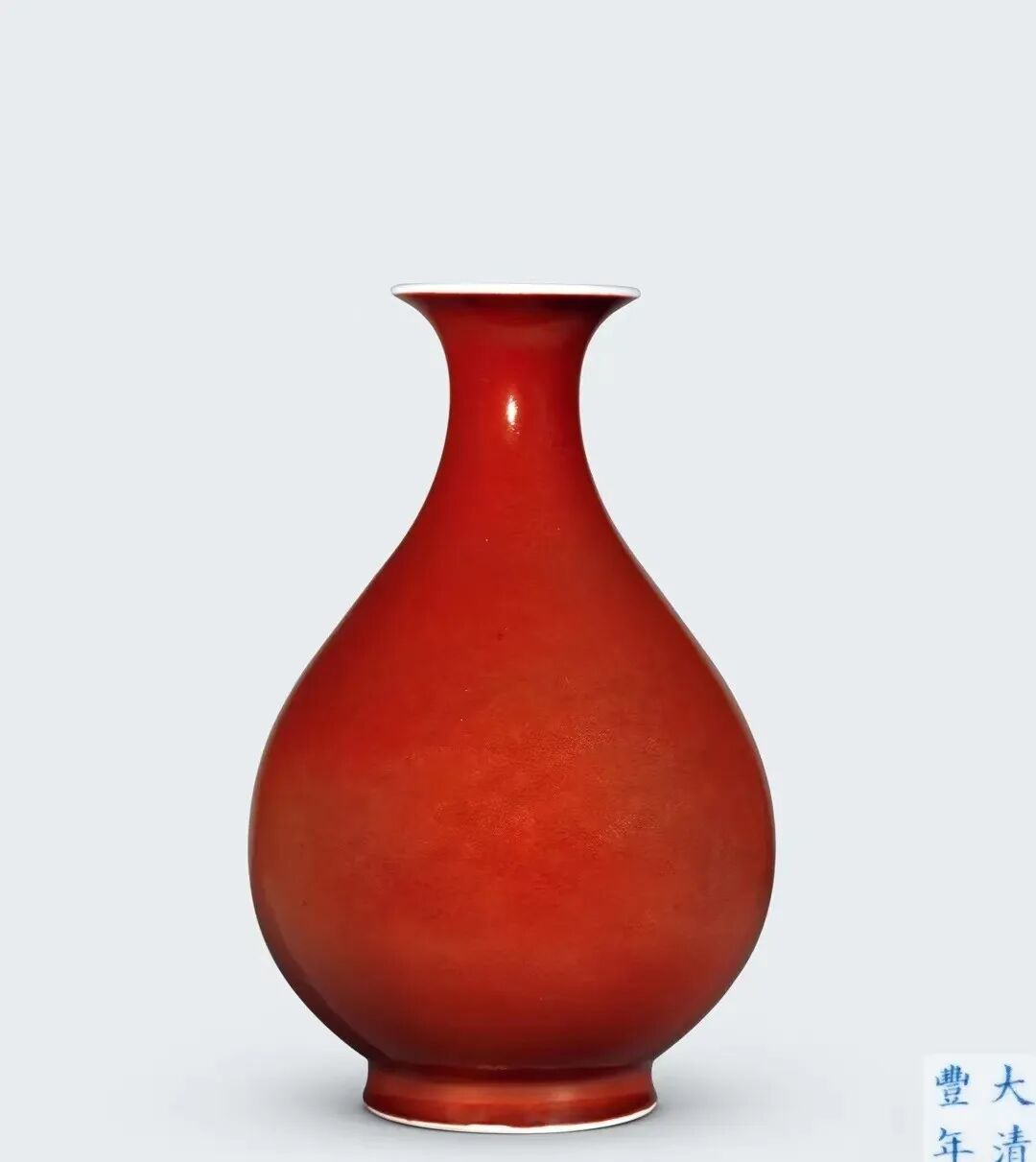 本品侈口,束颈,溜肩,圆弧腹略垂,及底内收,下承圈足,足墙微外撇,胎体细腻紧致,造型周正俊秀,线条流畅。瓶外壁通施红釉,发色纯净,均匀光滑,鲜红欲滴,似血如霞,娇艳动人。外底心以青花书“大清咸丰年制”六字双行楷书款。