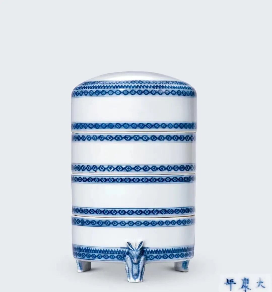 盒圆筒形,盖面隆起,共三层,下承三瑞兔为足,器型精致典雅。此式奁式叠盒于景德镇窑中始现于明代中期,应是仿自宋代漆制奁盒,但数量稀少。本品胎质坚实洁白,釉质肥润晶莹。底足处,三兔目光炯炯,作踞伏负托之状,憨态可掬,别具一格,其通体毛发以青花线条描绘,根根分明,凸显工匠绘画之细腻。盒顶中心以青花绘团凤纹,常见于同时期青花及釉里红茶圆装饰。每层均以几何纹为边饰,简洁干练,青花色泽优雅清丽,配以大面积留白,层次分明,愈显质地晶莹,凸现康熙御窑简约典雅之感。器底呈玉璧状,中心内凹处青花书“大清康熙年制”六字三行楷书款,字体遒劲清秀,为标准臧窑款识。