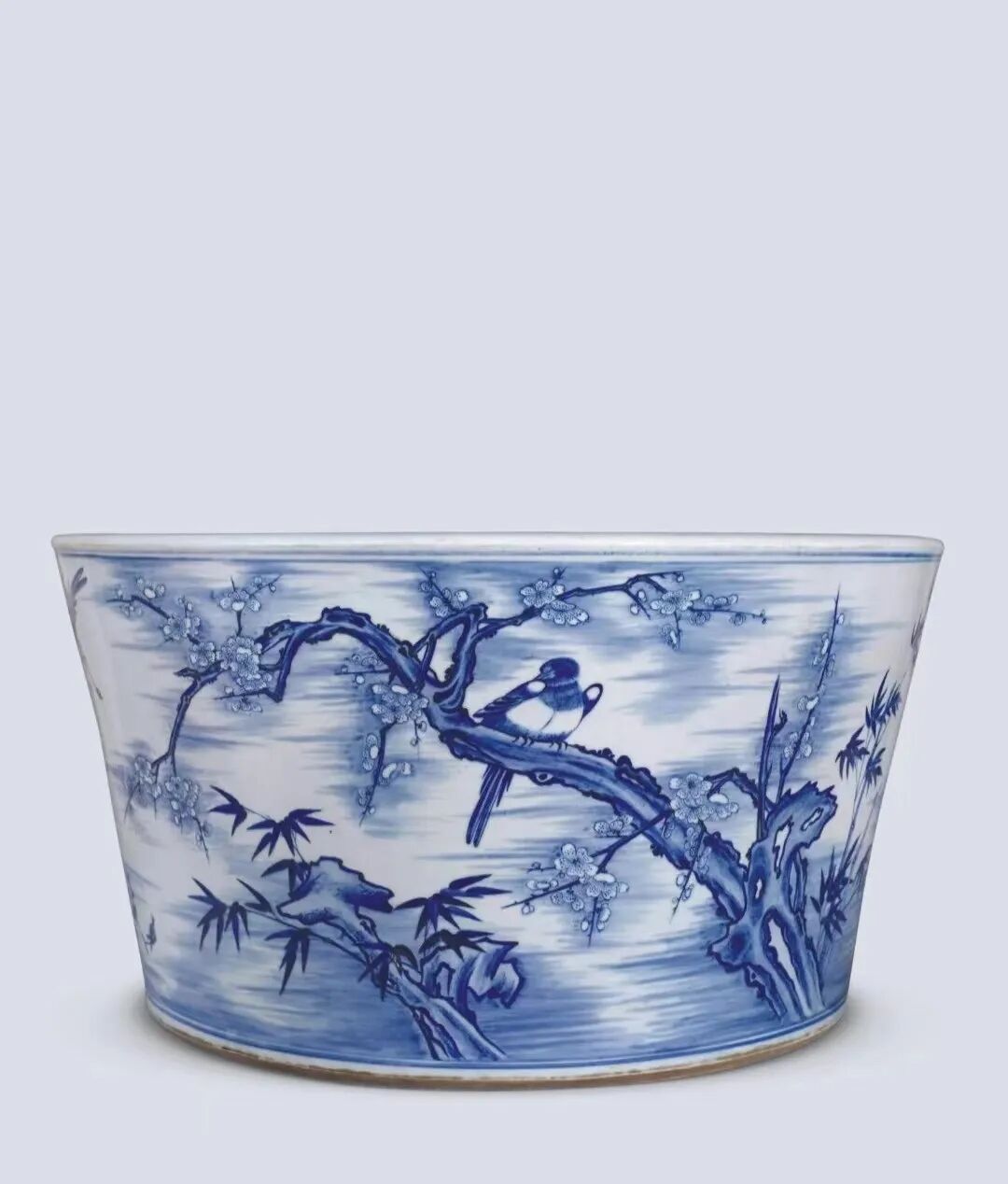 本品敞口,斜直腹,下承内挖式圈足。鱼浅内外施透明釉,釉面光洁素净,清润怡人。外壁釉下通体以青花通景绘双清四喜图。画面中洞石、寒梅、月季相依而生,梅树硕杆虬枝,枝头梅花或含苞,或怒放,蕊蕾清晰可见。画面中四只喜鹊姿态各异,或立于枝头,或飞舞于半空中,翎羽描绘纤毫毕现,体态极为灵动,具有“四时报喜”之吉祥寓意。主题画面间又兼生湖石翠竹,呈随风摇曳之姿,与梅花暗合“梅竹双清”之意。整幅画面构图疏朗清晰,勾勒晕染有度,颇具文人工笔花鸟画之意韵,其以浅淡青花晕染来表达月影效果,亦为本品增色良多,堪称康雍时期瓷绘丹青隽品。