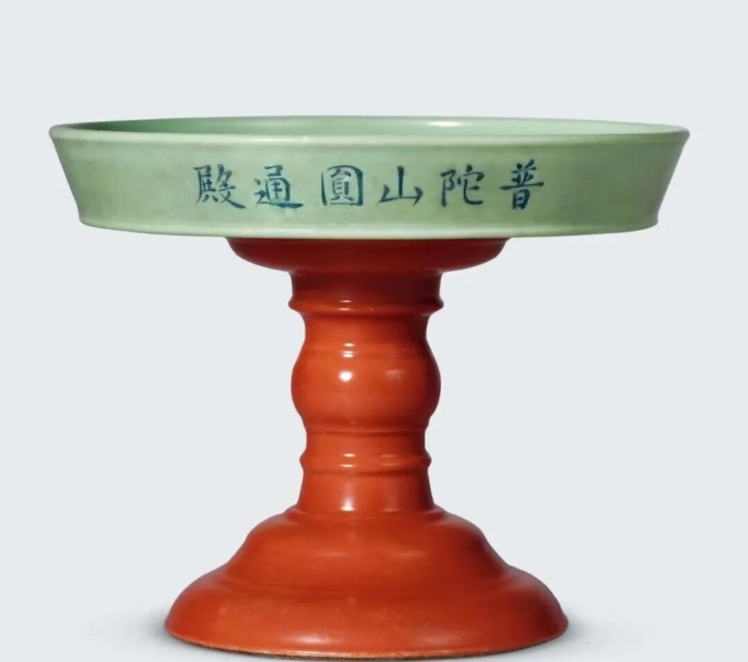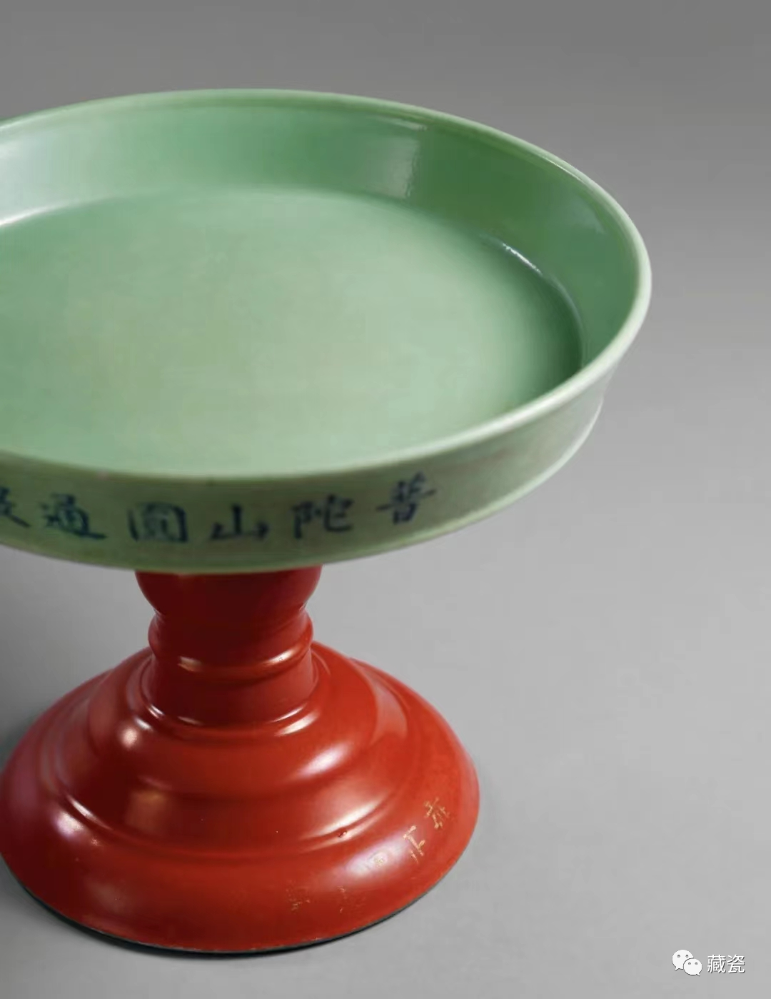 供盘由承盘及高柱座两部分构成,典雅隽巧,胎骨细腻,造型借鉴融合商周青铜豆及战国时期漆木豆,康熙御窑初见。承盘唇口外撇,斜直壁,内外均施湖水绿釉,并于外侧以蓝彩书“普陀山圆通殿”款。高柱座外施珊瑚红釉,仿朱漆色泽,足胫一侧以金彩书“雍正甲寅(1734年)沈阳唐英敬制”十字单行楷书款。