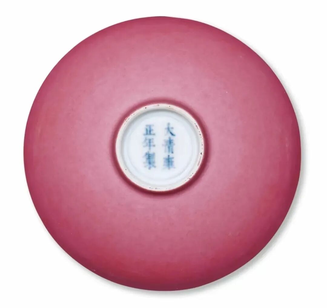 据尺寸判断,本品应为清宫档案中记载的“茶圆”。查阅资料还可以发现,相同造型和款识的茶圆,尚见有白釉作品传世,故宫博物院即有收藏。清宫档案中有许多雍正皇帝指示造办处在宫内和圆明园烧造珐琅彩的记载。本品所用的胭脂红彩料,以及相同造型作品的柠檬黄彩料等,皆属于珐琅彩料。因此如本品一类作品的烧造,推测存在这样一种可能:即先于景德镇烧造并精选上好白胎,再送至宫中,施以胭脂红、柠檬黄等彩料,或描绘其他纹饰,其档次比寻常御窑瓷器高出许多。