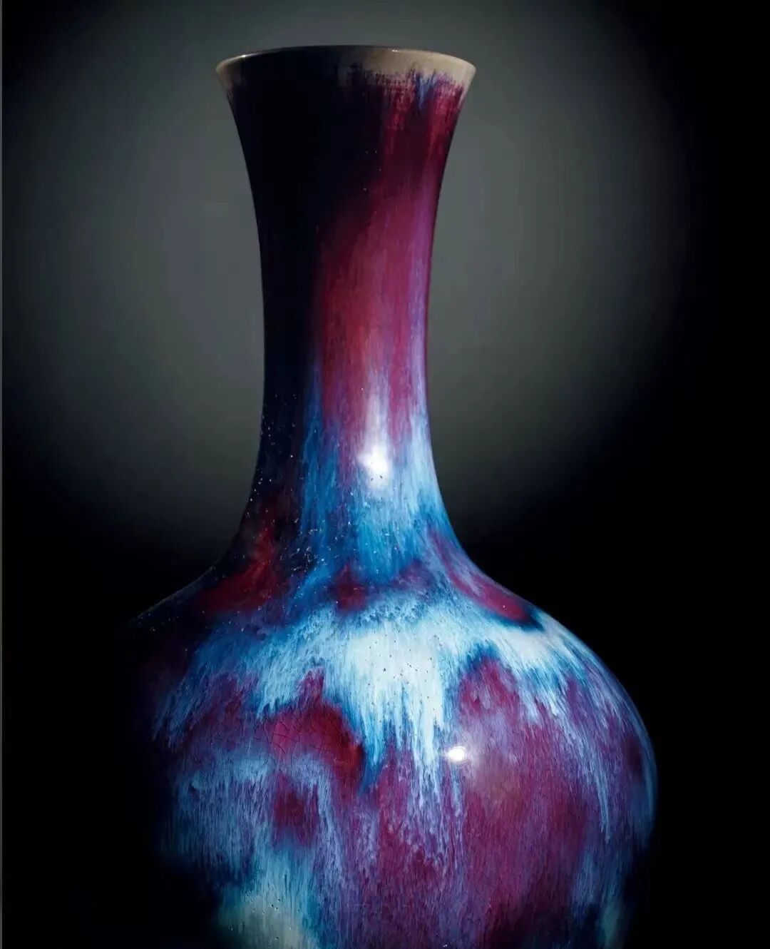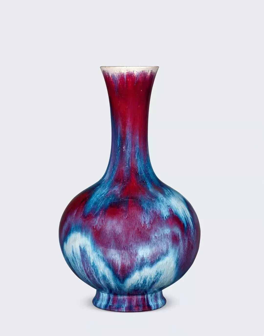 本品器型端庄大方,线条起伏多变,造型挺拔秀美,为清宫御瓷典范之作。瓶口部略外撇,细长颈,丰肩,腹部浑圆,呈球形,下承圈足,足墙外撇。通体施窑变釉,以红为主色,紫、蓝、月白与红色相交融,色彩绚丽,釉质晶莹,釉表形成细密的开片。其窑变釉肥厚润泽,宝光晶莹,呈色异常美妙,苍褐者沉稳如地,青蓝者幽寒如水,艳红者炽烈如火,其交错融流之状,如风动云霞,变换旖旎。瓶优美典雅至极,器身不加雕镂,别无装点,唯以釉色取胜。外底心暗刻“大清乾隆年制”六字三行篆书款,为乾隆早期款。