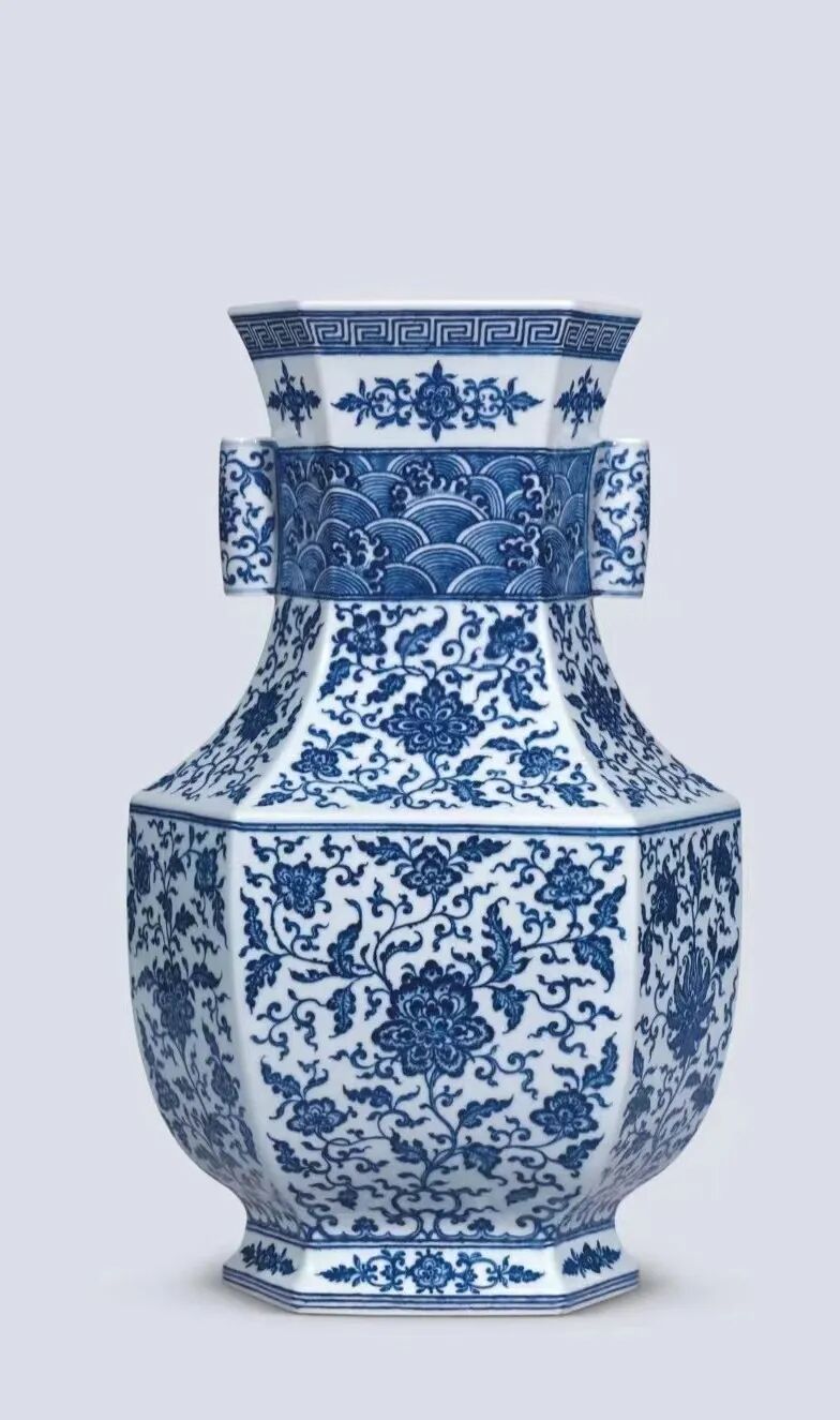 本品撇口,束颈,颈部置对称贯耳,折肩,六方腹及底内收,下承高圈足。其造型即取法青铜礼器,端庄大气,线条优美流畅,古朴而典雅。瓶内外施透明釉,釉下以青花为饰。自上而下可达六层。口沿、胫部、外足墙分别绘以回纹纹,贯套花卉,海水纹。肩及腹部分别以缠枝莲纹为饰,枝卷叶茂,勾连绵密,繁花似锦,极具美感。整器青花色泽层次鲜明、浓淡相宜,苍雅之气跃然眼前,工匠鬼斧神工的技艺表现得淋漓尽致。尊釉面莹白坚致,与青花相衬,臻乎妙境。器底青花书“大清乾隆年制”六字三行篆书款。