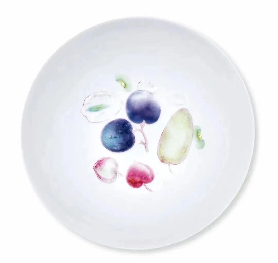 胭脂红器深得雍正皇帝喜爱,除内廷使用外,也作赏赐用,雍正十年(1732年)三月五日《各作成做活计清档》便有载“经适房笔帖式太监沈玉功持来珐琅瓶一件……洋红酒圆四件……说宫殿监督陈福、副侍刘玉传:着用棉花塞垫配木箱盛装,包裹黑毡,发报赏琉球国。”本品造型灵秀,白釉清透滋润,胭脂红釉细腻均匀,内里色彩明快的瓜果纹样,更是点睛之笔,是为雍正御窑无上珍品。