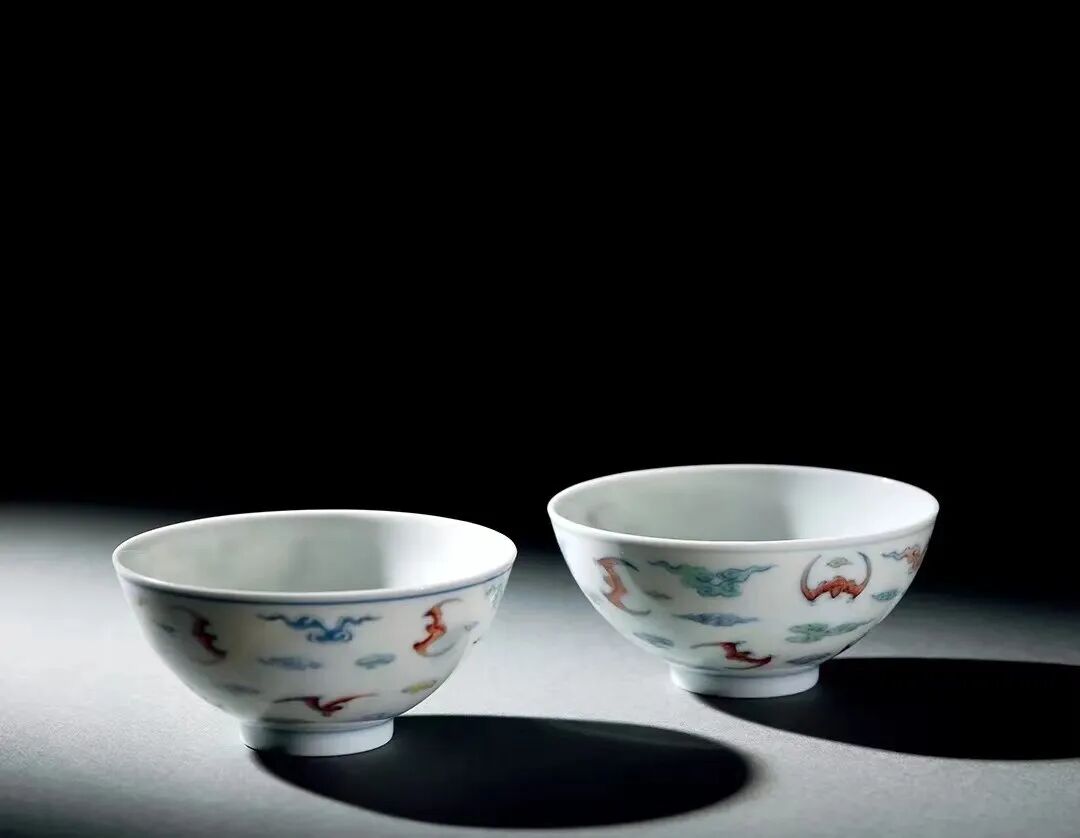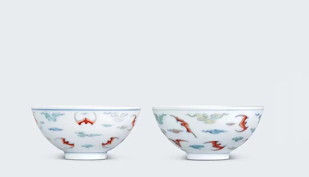 本品侈口弧腹,下承圈足,胎体轻薄,式样优雅,盈盈一握,娇巧怡人。杯釉质温润莹洁,外壁以斗彩绘云蝠纹,布局和谐,红蝠翩飞,以橙、绿、黄、紫、蓝彩填绘的五彩祥云萦绕其间,构成清代流行的吉祥纹饰,寓意“千云祥集”、“洪福齐天”。杯底青花双圈内书“大清雍正年制”六字双行楷书款。