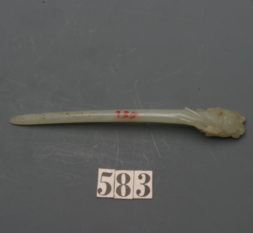 沿续雍正朝以来的菇形簪首,惟近簪首处略作转折,全簪浅琢如意纹,流畅的线条,细腻的打磨,玉质温润。