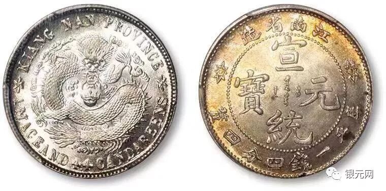 宣统三年9月21日至10月11日,铸造一元银币70.25万枚,二角银币5.5万枚,一角银币1万枚。现存世的有”江南省造宣统元宝”1.44和7.2分两种。