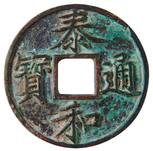 金章宗完颜璟也以善书瘦金体闻名,亦喜撰写钱文,故其所铸“泰和通宝”楷书折十大钱。犹有宋徽宗时“宣和”“大观”诸钱之余风,被后人称为宋徽宗的“转世灵童”。