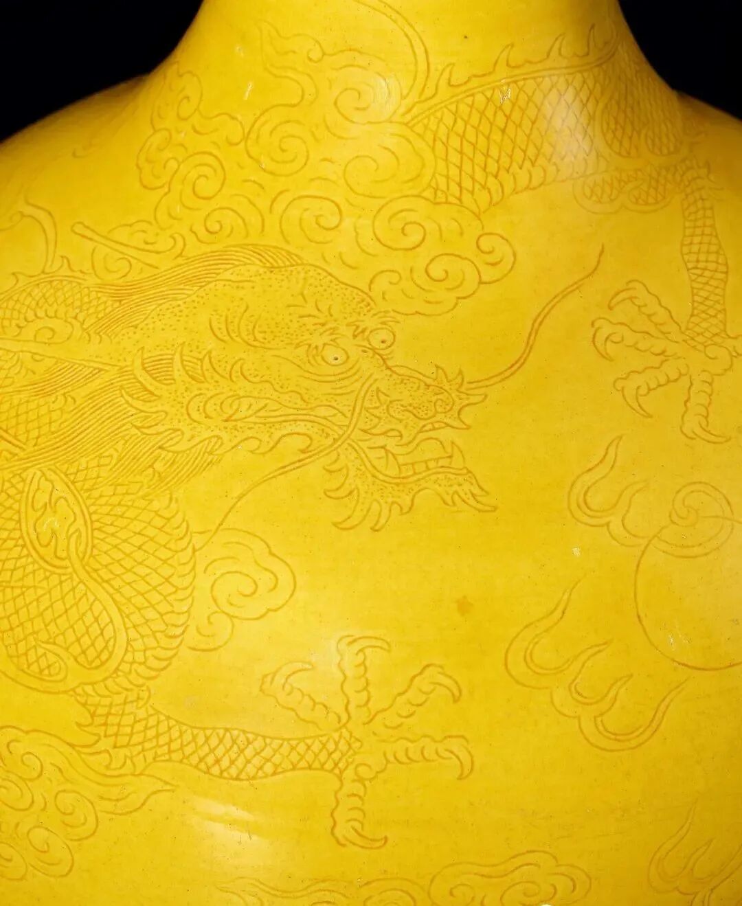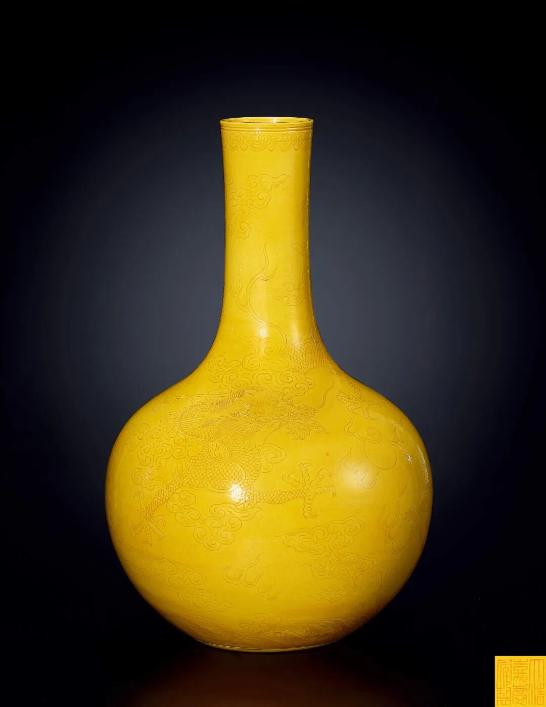 清嘉庆 黄釉暗刻「苍龙教子」云龙纹天球瓶(350-550万)