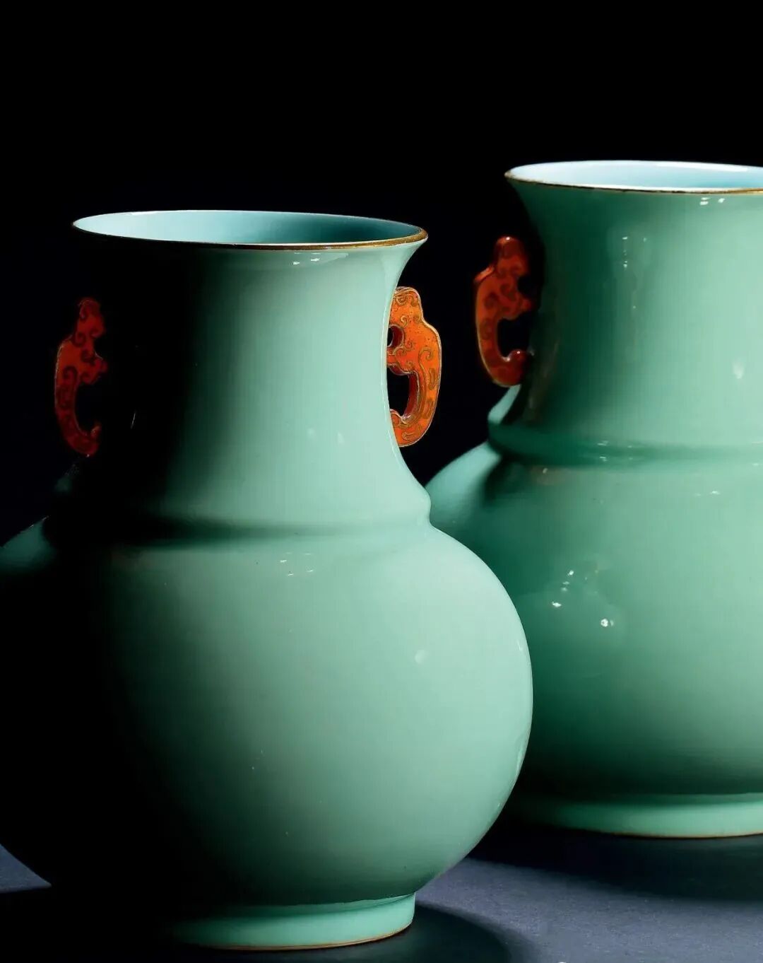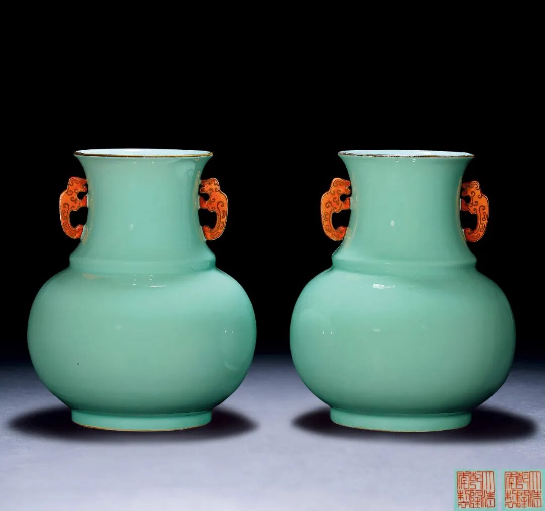 清乾隆 淡绿釉双夔龙耳尊一对(360-600万)