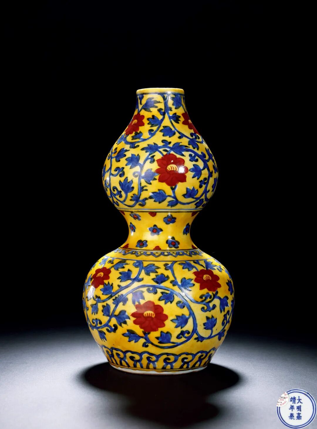 明嘉靖 黄地青花矾红缠枝花卉纹葫芦瓶(80-180万)
