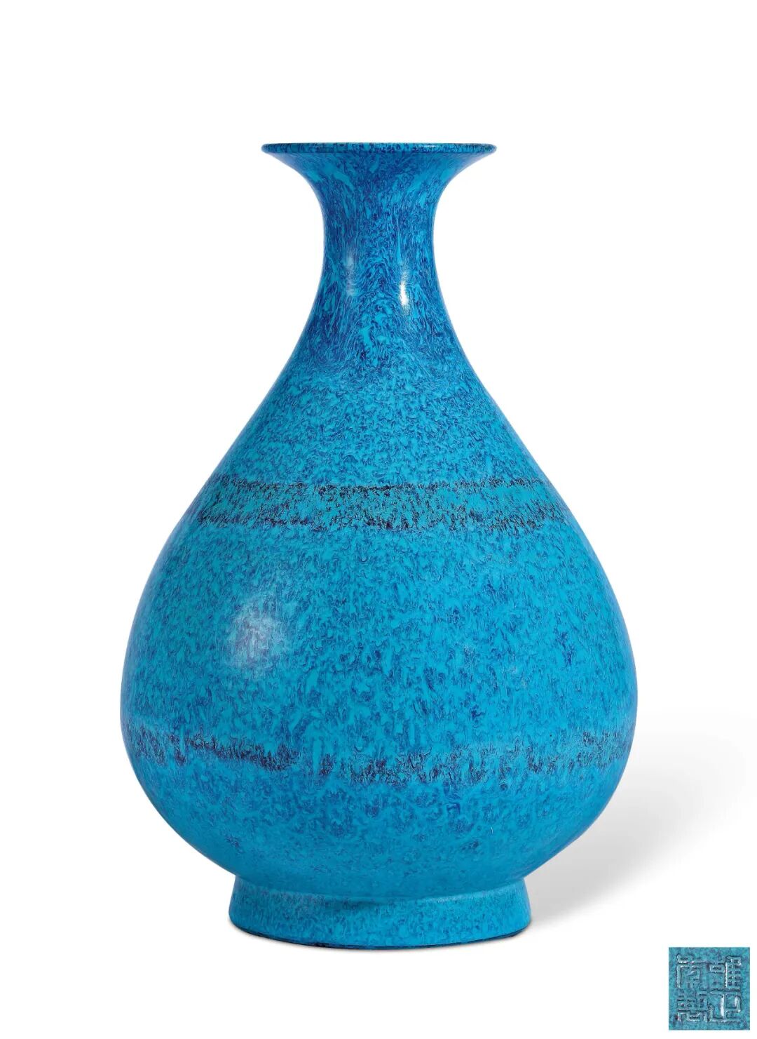 据唐英的《陶成纪事》记载,雍正朝仿古创新的各种高低温颜色釉便列出五十七条之多,其中对炉钧釉的描述为「色在广东窑与宜兴挂釉之间,而花纹流淌过之」,在其所载试配成功与通用的十九种釉水品种中,炉钧釉居首,颇受皇室青睐。雍正朝炉钧釉器物多作仿古或本朝经典造型,多见荸荠瓶、蒜头瓶、铜炉等造型,玉壶春瓶极为少见。目前资料尚未见造型、装饰与之皆相同的藏品。