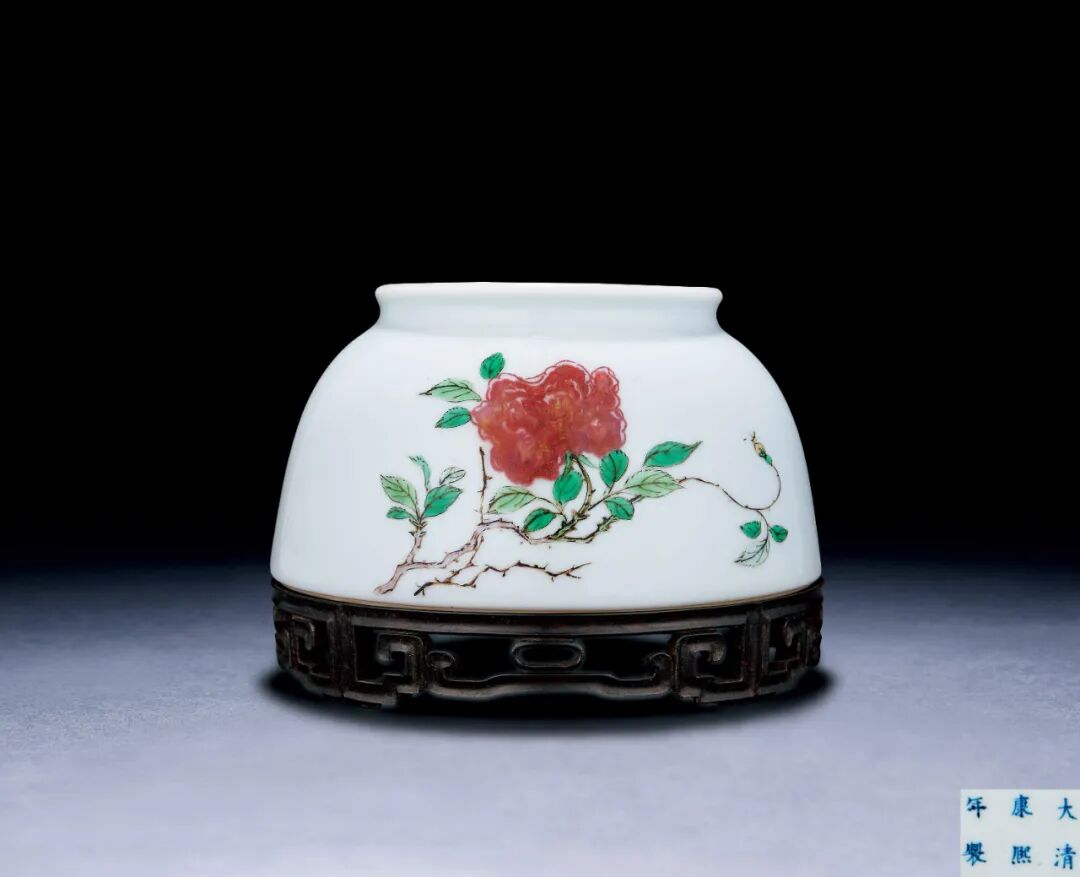 康熙朝御窑所制文房用器种类之丰,造型之奇,釉色之秀雅,均可称冠于世。此件釉里红加红绿彩马蹄尊即为盛世熙朝下诞生的文房佳器。其款识与康熙御窑名品豇豆红八大码完全相同,应为同一时期所作。此外,这种高温釉里红和低温釉上彩相结合的装饰技法,仅用于如本品一类的马蹄尊和同样纹饰的小口水盂之上,特色鲜明,数量稀少,品级甚高。