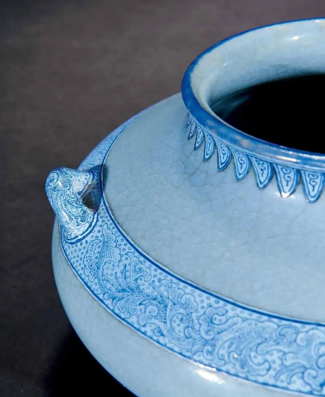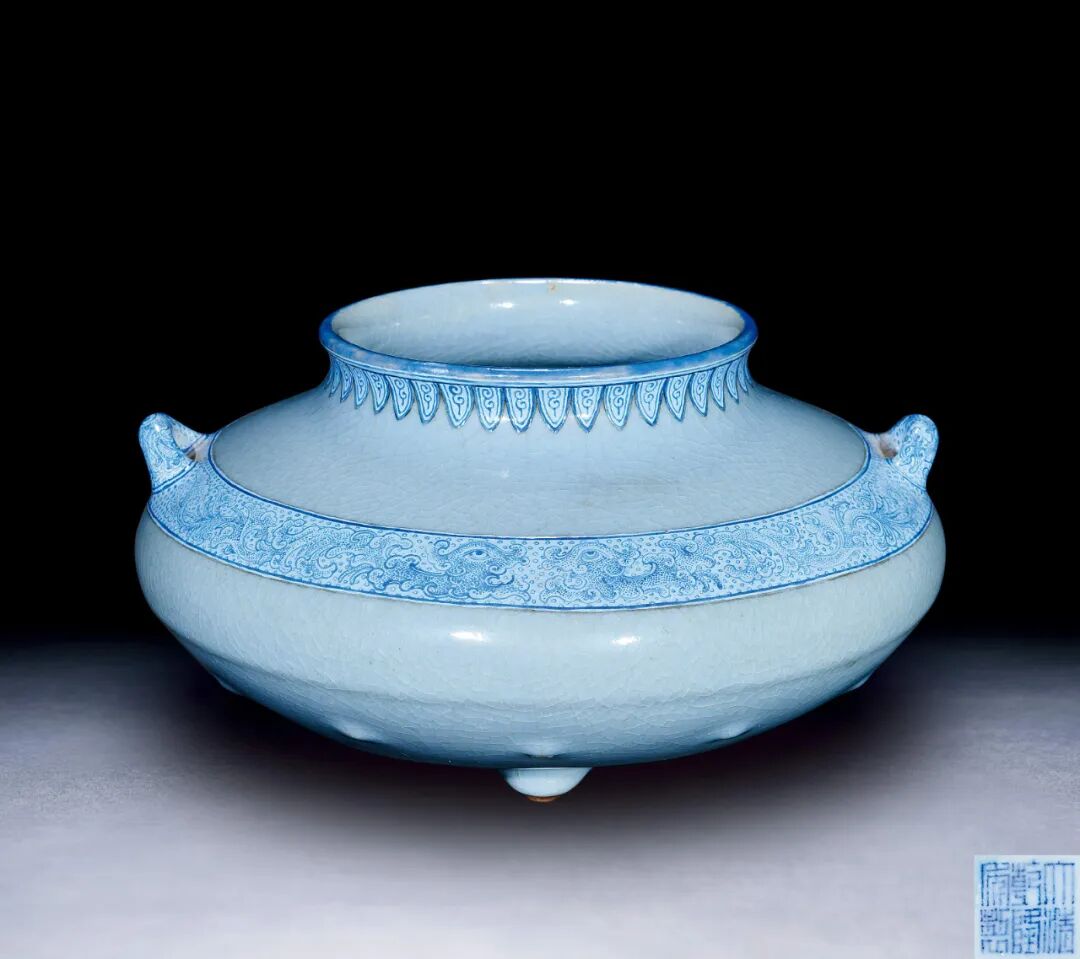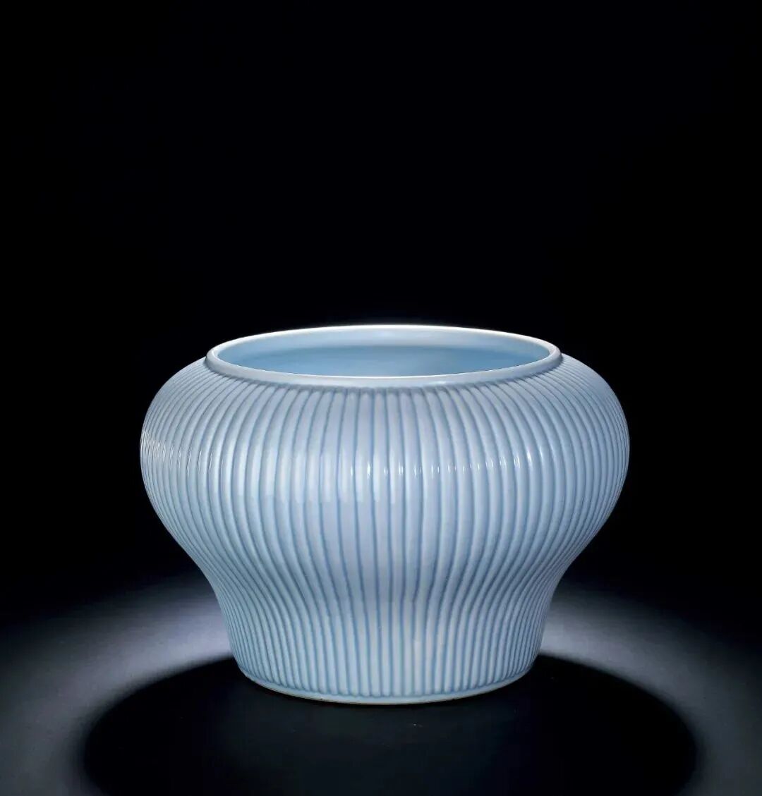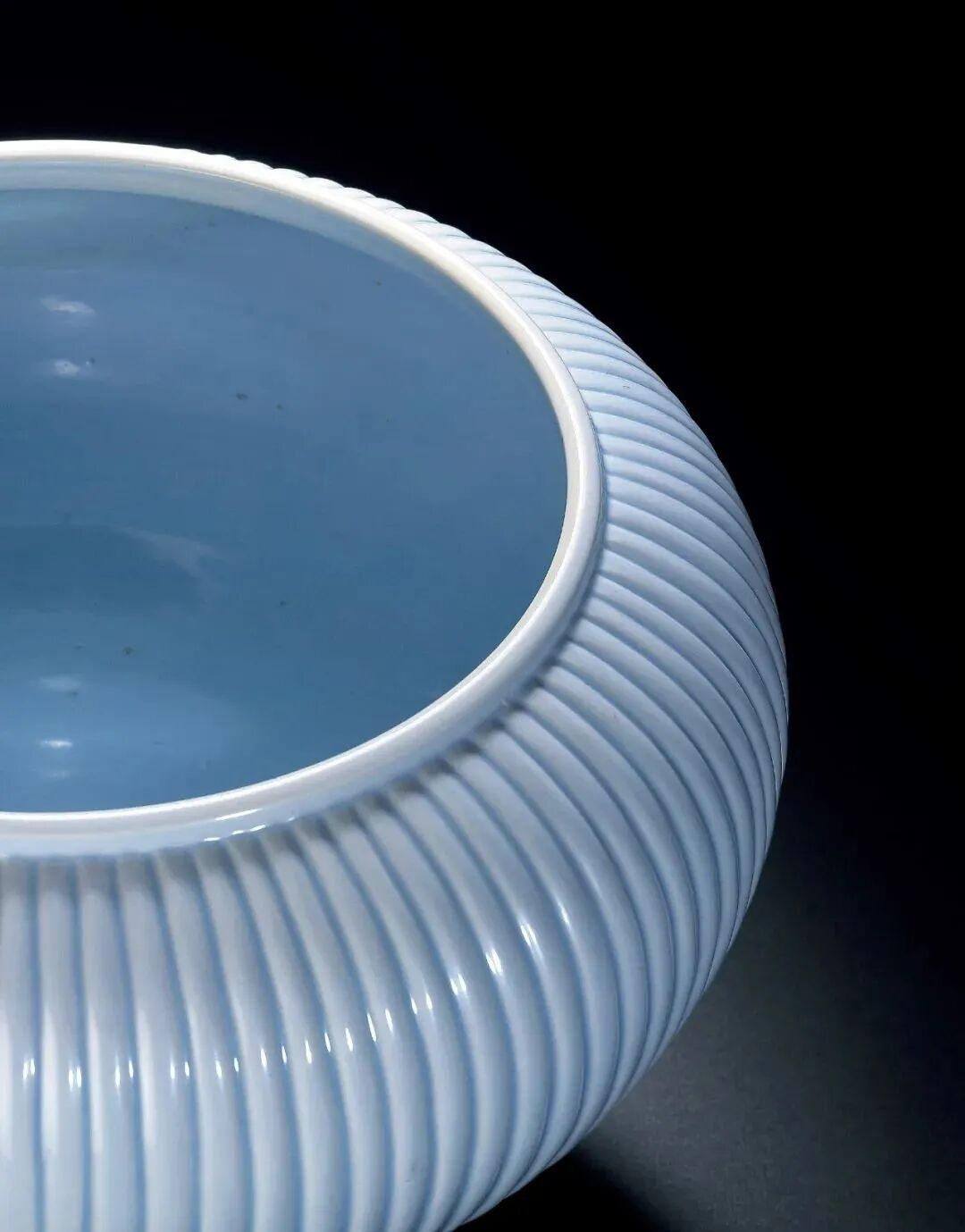 天蓝釉是含氧化钴的高温色釉,为康熙年间景德镇御窑厂创新釉色。其釉色淡雅悦目,似天青之蓝,故名「天蓝釉」。可与同一时期创烧的豇豆红釉媲美。天蓝釉更多用于文房瓷器,器物种类则多见于精巧小件,而文房案缸之类甚为罕见,且完整传世极少,至雍正、乾隆时期才用于瓶罐等大件器型。