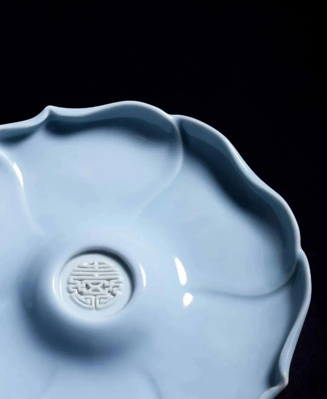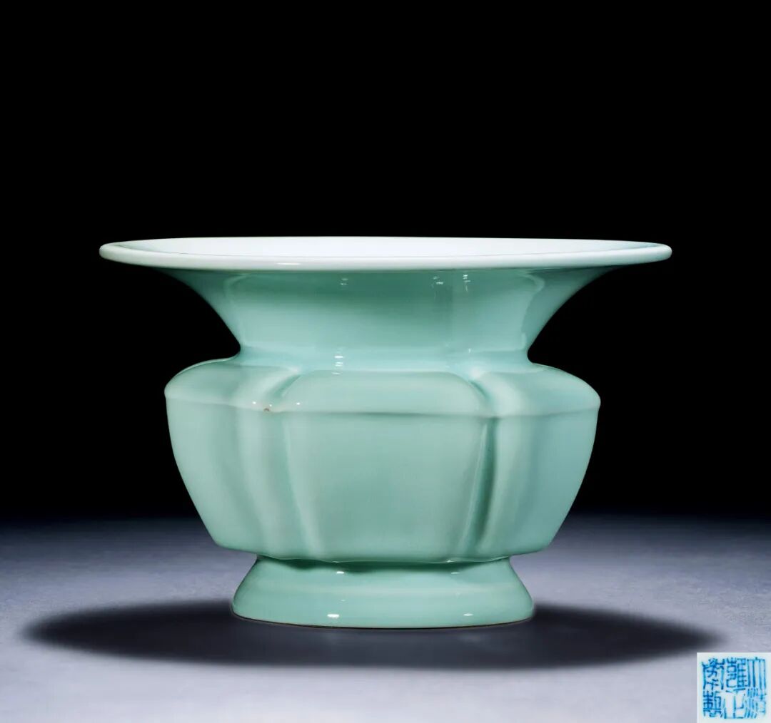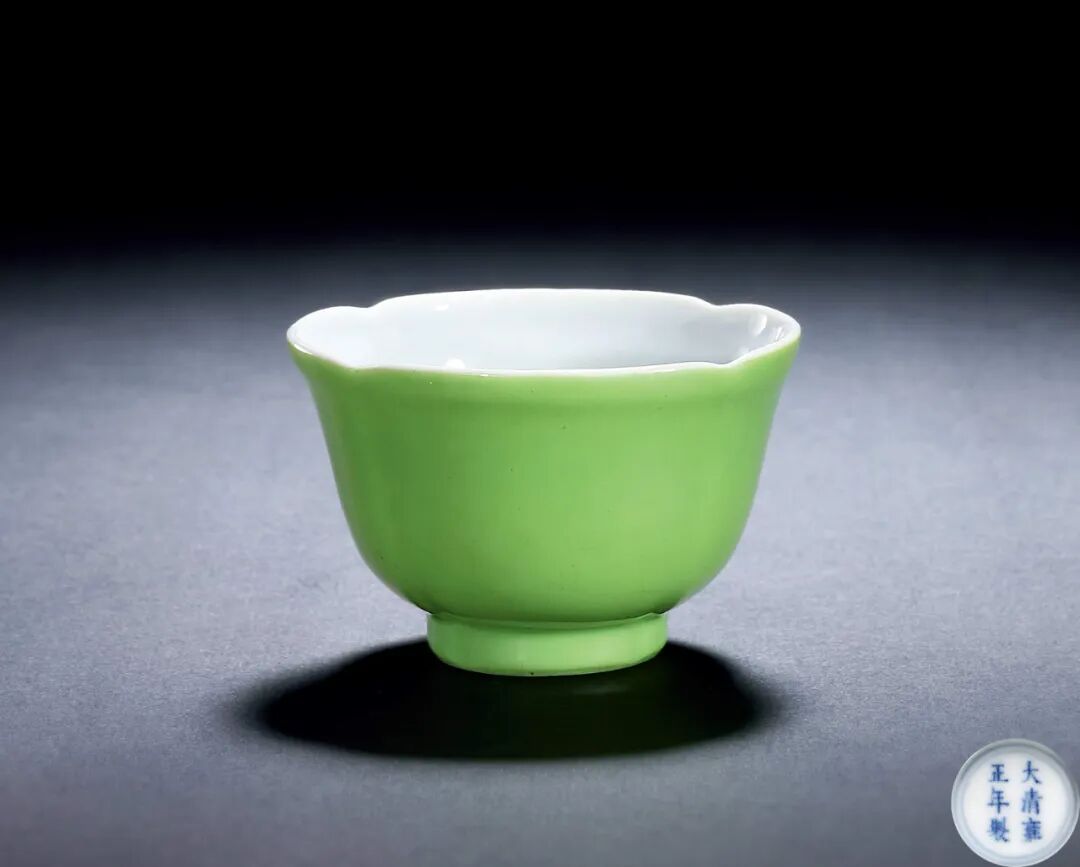 清初,际景德镇窑厂已掌握十分成熟的绿釉配方和烧造技术,釉色可达翠色怡人之境,烧成时釉中的铜大部分被氧化而形成深浅不一的绿色,一般在浅绿色底上杂有深绿色斑点,少数地方微泛红色,酷似新鲜苹果。在康熙二十年,此种釉瓷正式成为官窑烧造的品类之一。而传世品与馆藏品种,此类湖水绿釉器物并不多见,菊瓣盘更为罕有,翻阅海内外公私资料,鲜见类品,极为珍贵。传世所见施湖水绿釉的器物极为罕见,北京故宫博物院藏有一套湖水绿花杯及盏托,造型精巧别致,应是御窑厂专为康熙皇帝所制的订烧瓷器,档次极高。
