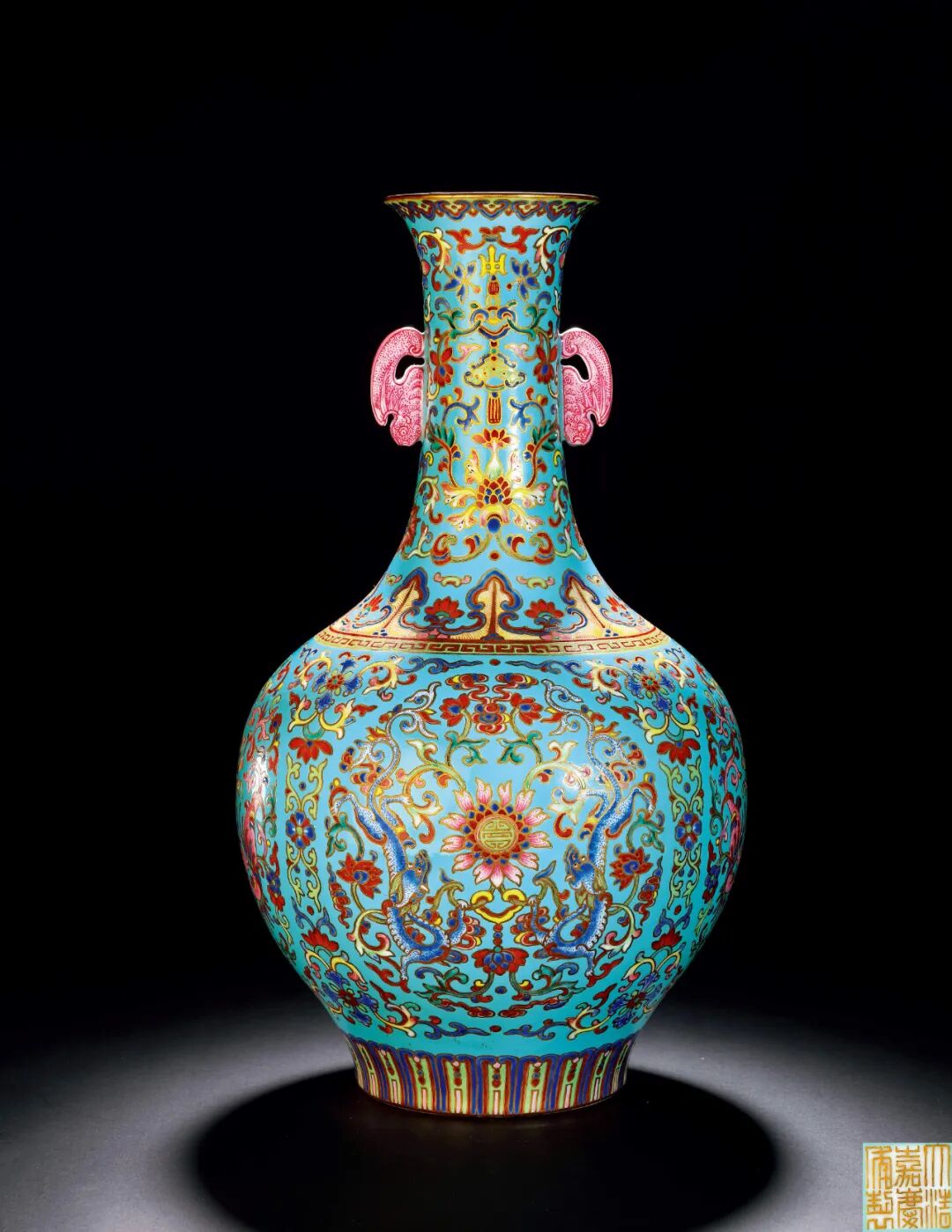 清嘉庆 松石绿地粉彩描金夔龙捧寿纹双福耳瓶(200-300万)