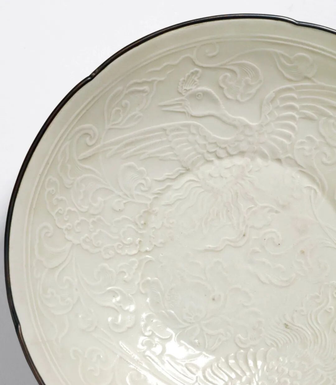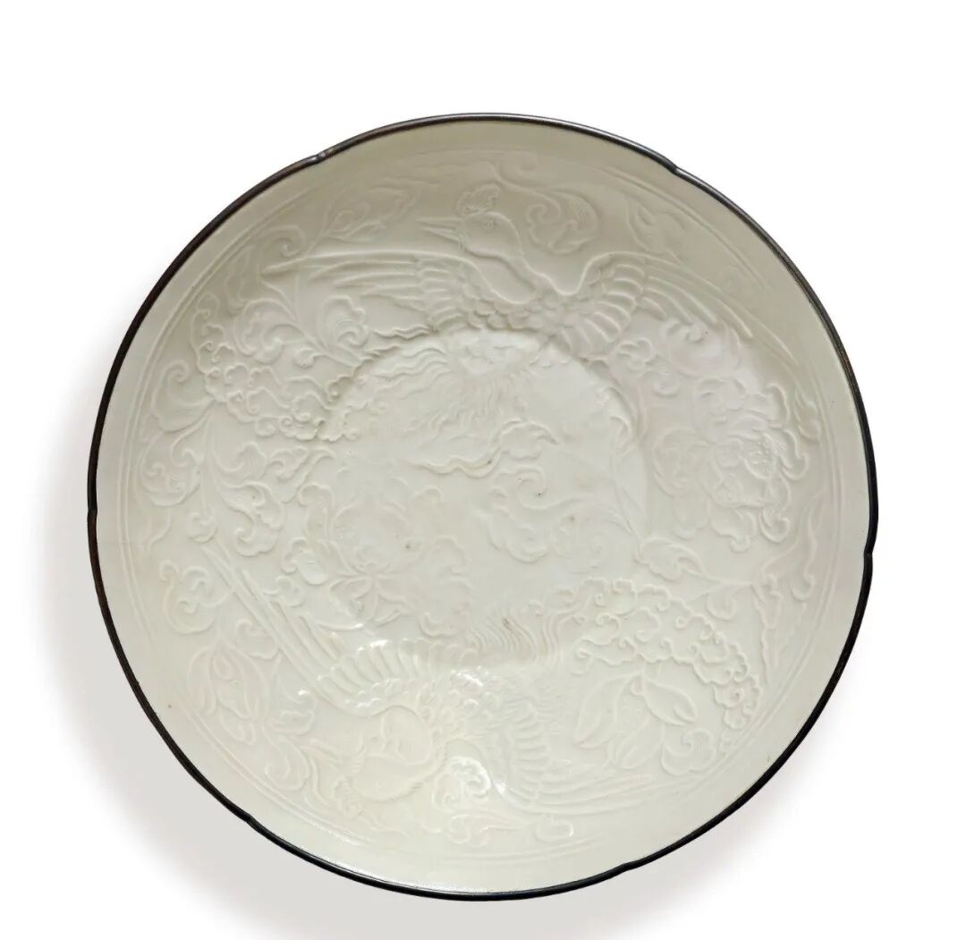 宋 定窑白釉模印孔雀穿花纹葵口盘(450-550万)